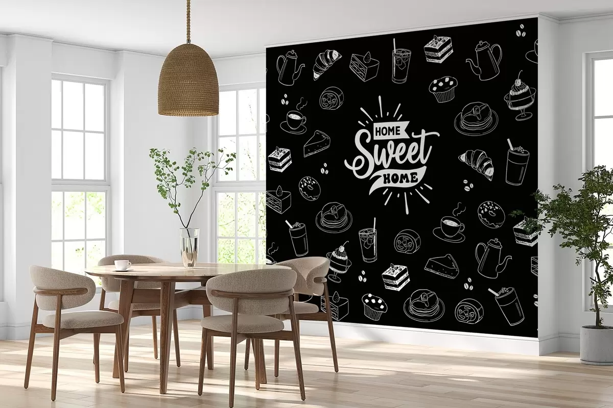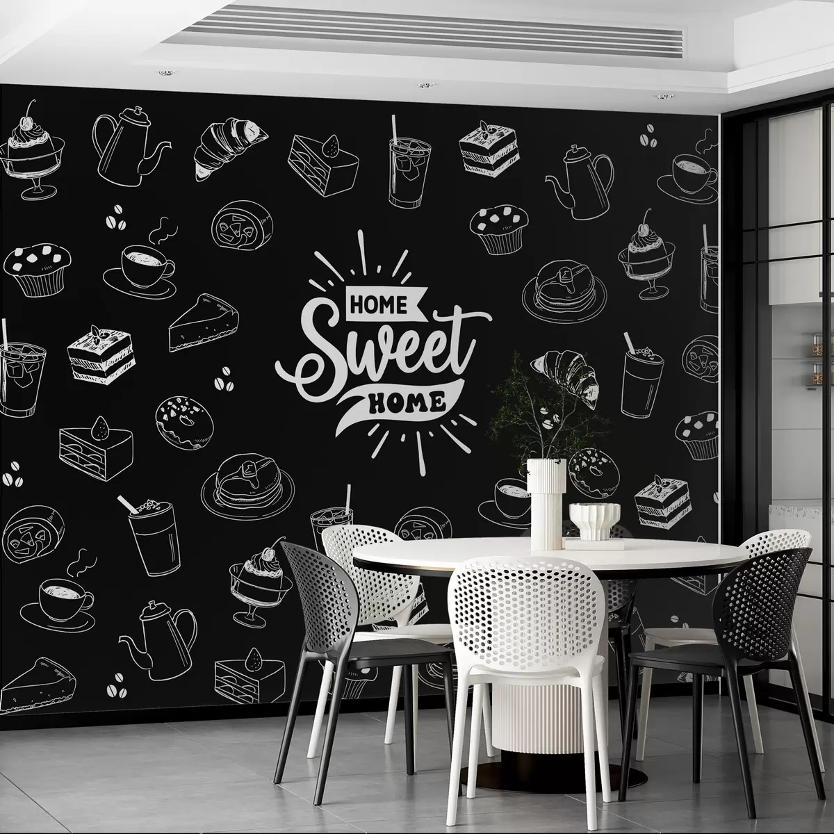 Τοιχογραφίες μαύρη ταπετσαρία για την κουζίνα με λευκά σχέδια Nr. w02349