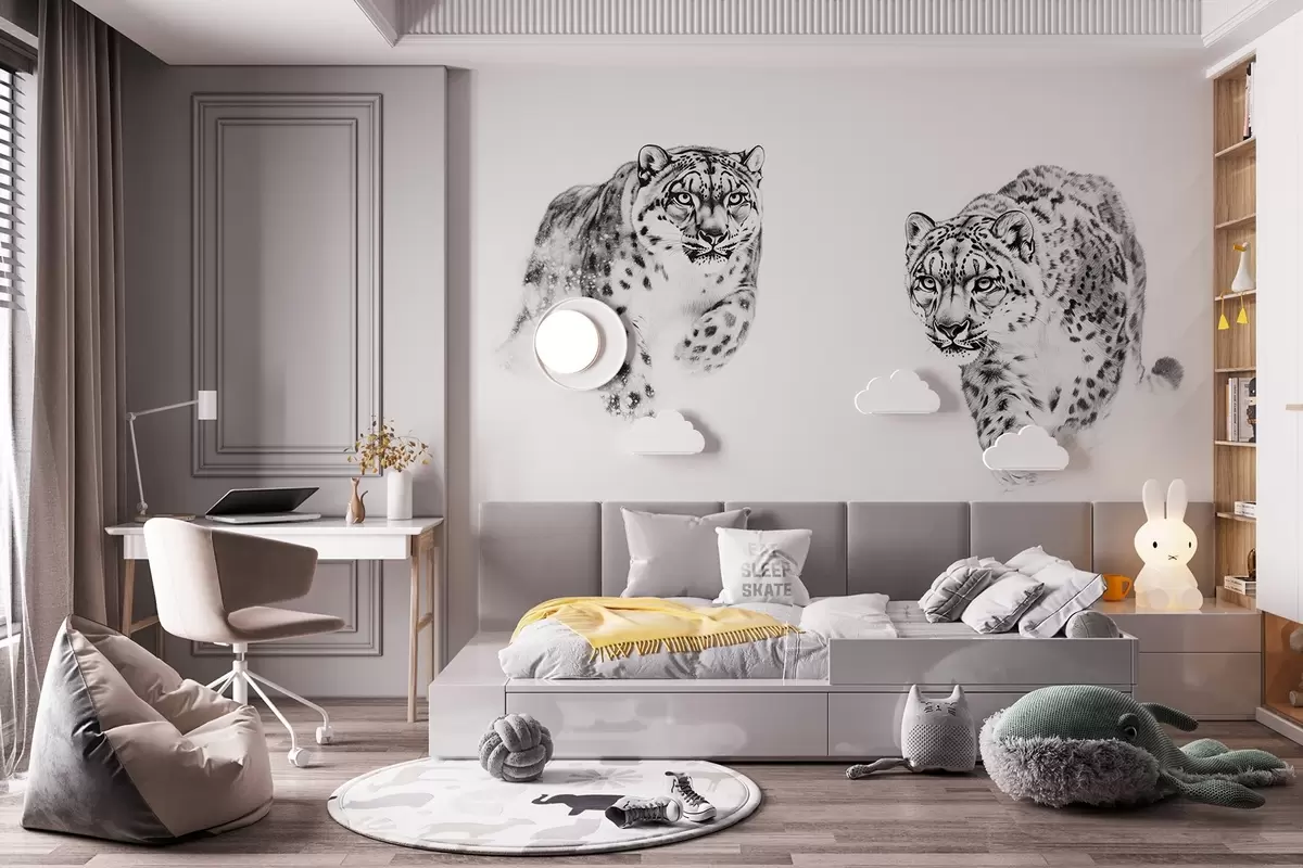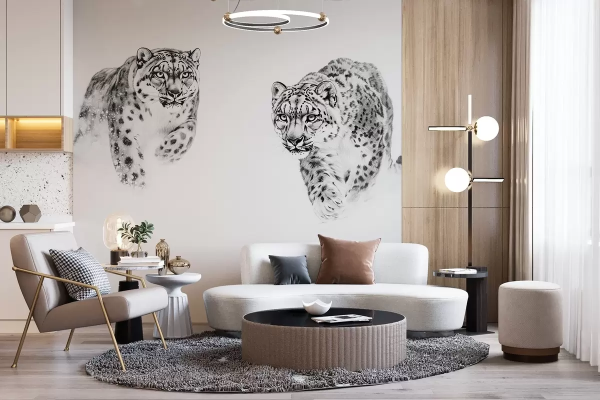 Τοιχογραφίες Λεοπαρδάλεις χιονιού, χειμώνας, άγρια ζώα, σχέδιο με μολύβι, μινιμαλισμός Nr. w02359