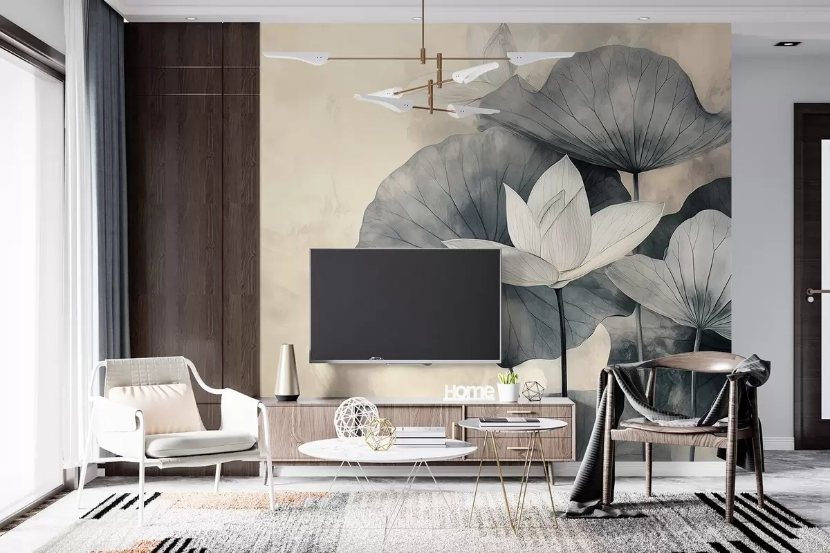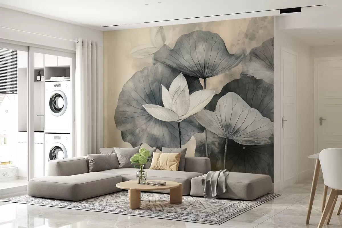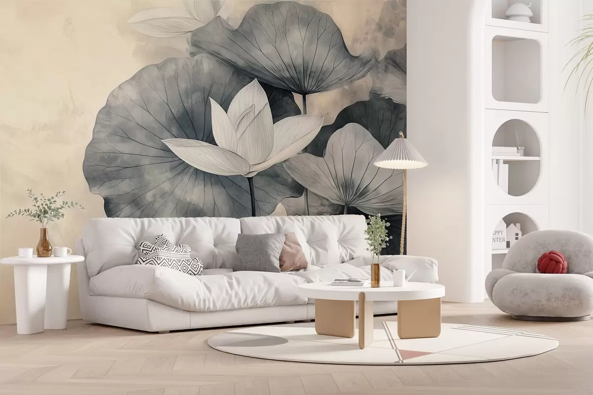 Τοιχογραφίες φύλλα λωτού σε παστέλ στυλ σε μπεζ φόντο Nr. w02405