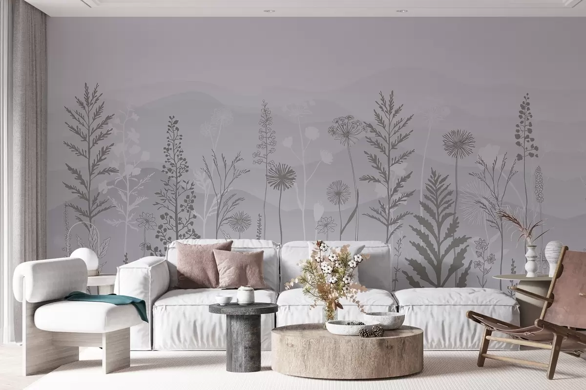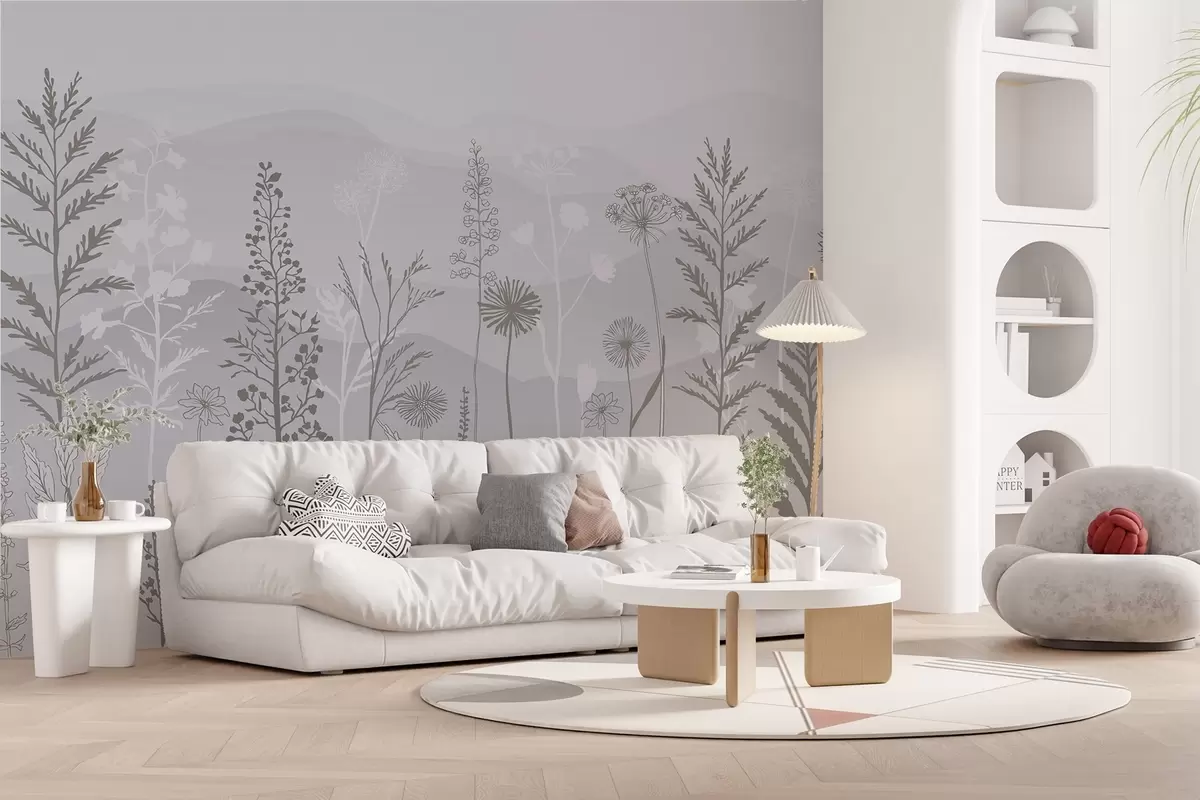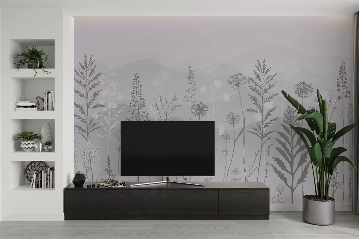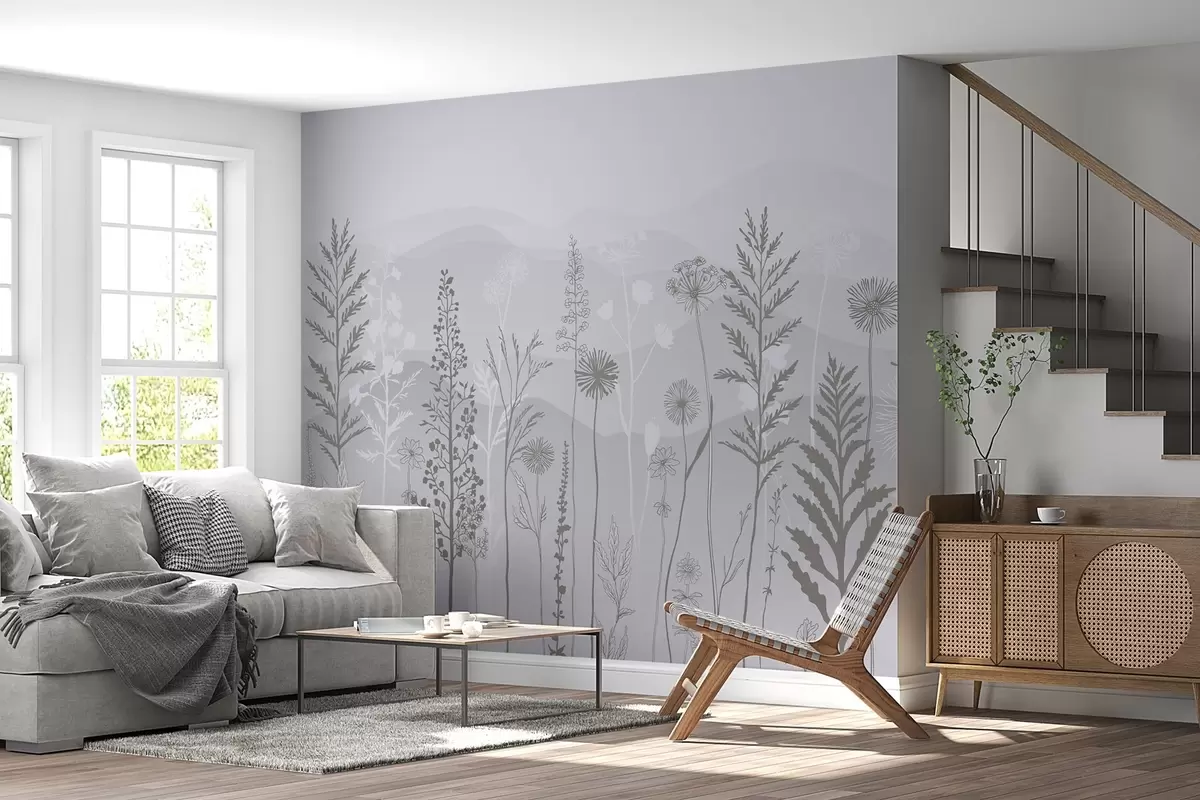 Τοιχογραφίες ταπετσαρία οικολογικού στυλ, αγριολούλουδα σε γκρι τόνους Nr. w02443