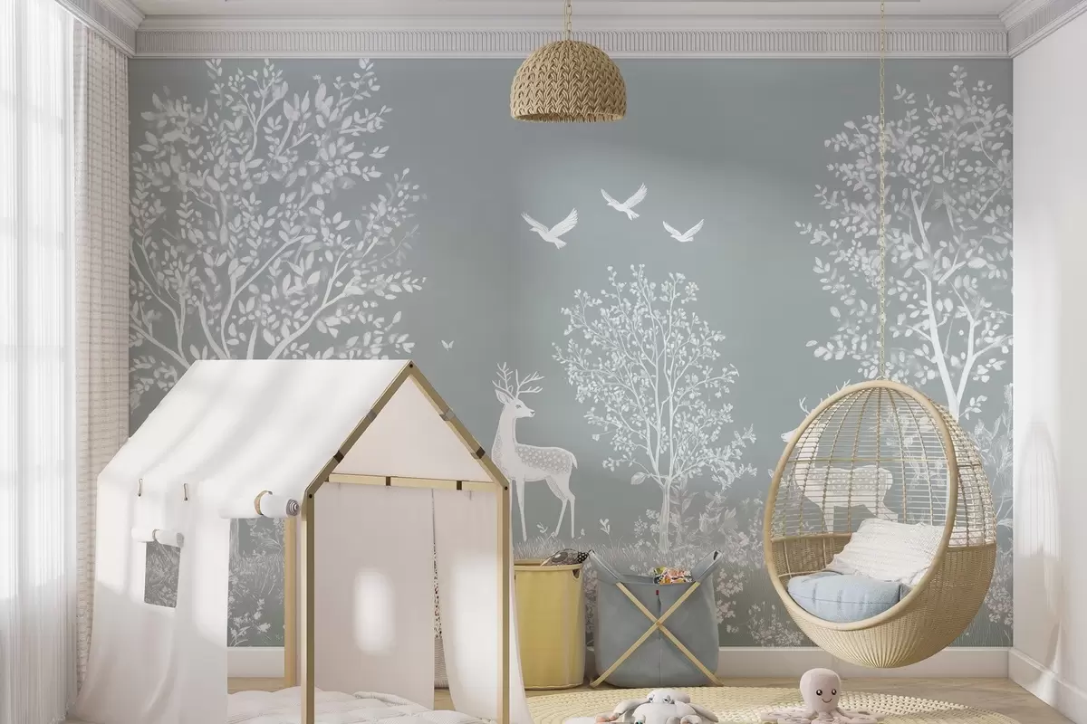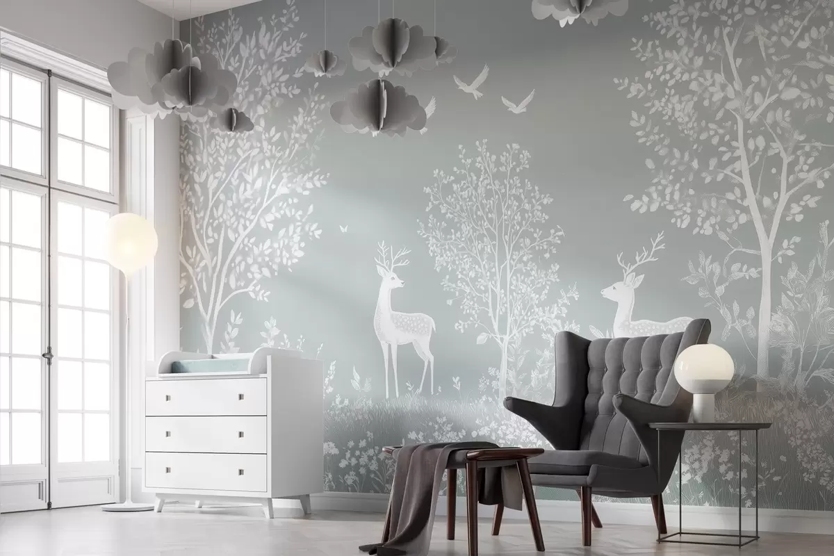 Τοιχογραφίες δάσος με ελάφια σε στυλ σχεδίου με κιμωλία σε γκρι φόντο Nr. w02444v2