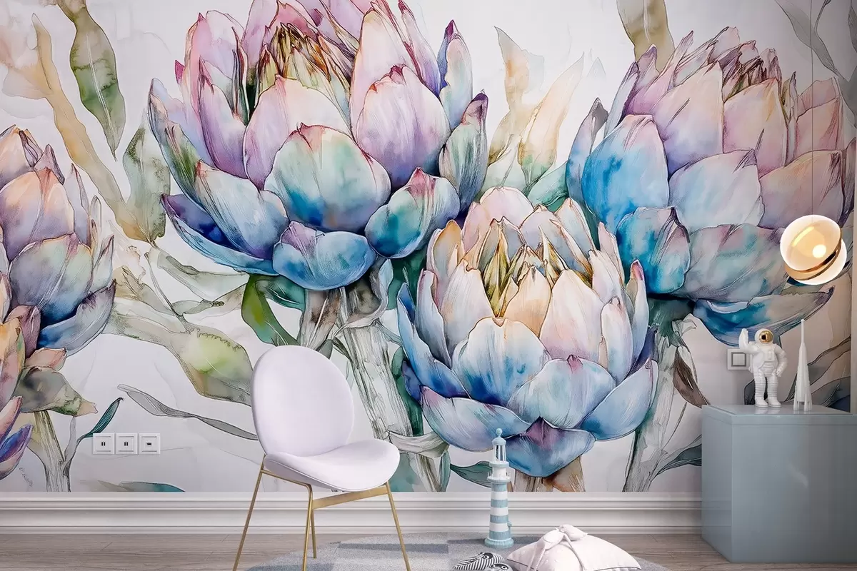 Τοιχογραφίες Αγκινάρες σχέδιο, στυλ ακουαρέλας, floral, μοβ, μπεζ, πράσινο Nr. w02484
