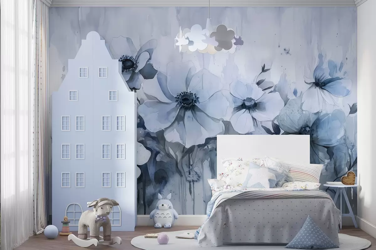 Τοιχογραφίες Ρουστίκ λουλούδια, σχέδιο σε στυλ υδατογραφίας, μπλε χρώματα Nr. w02487v1