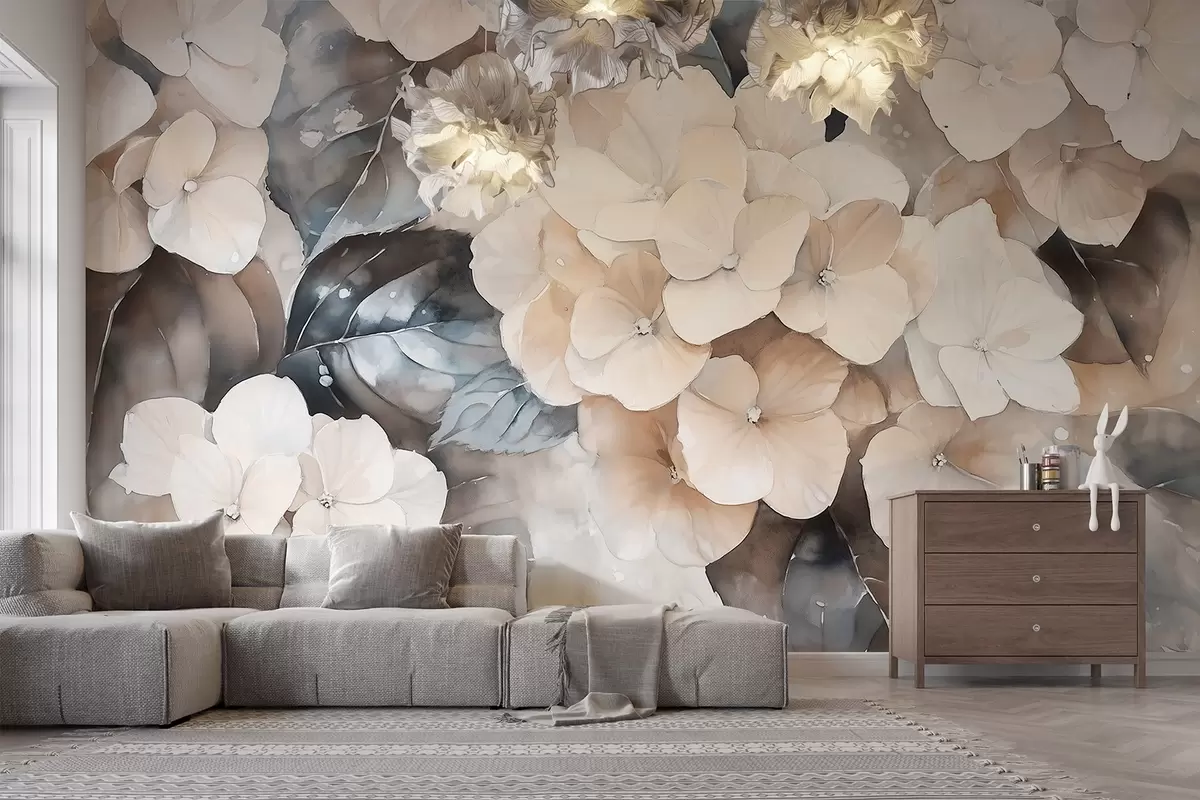Τοιχογραφίες Ορτανσία λουλούδια, υδατογραφία στυλ σχέδιο, μπεζ χρώματα, floral Nr. w02488