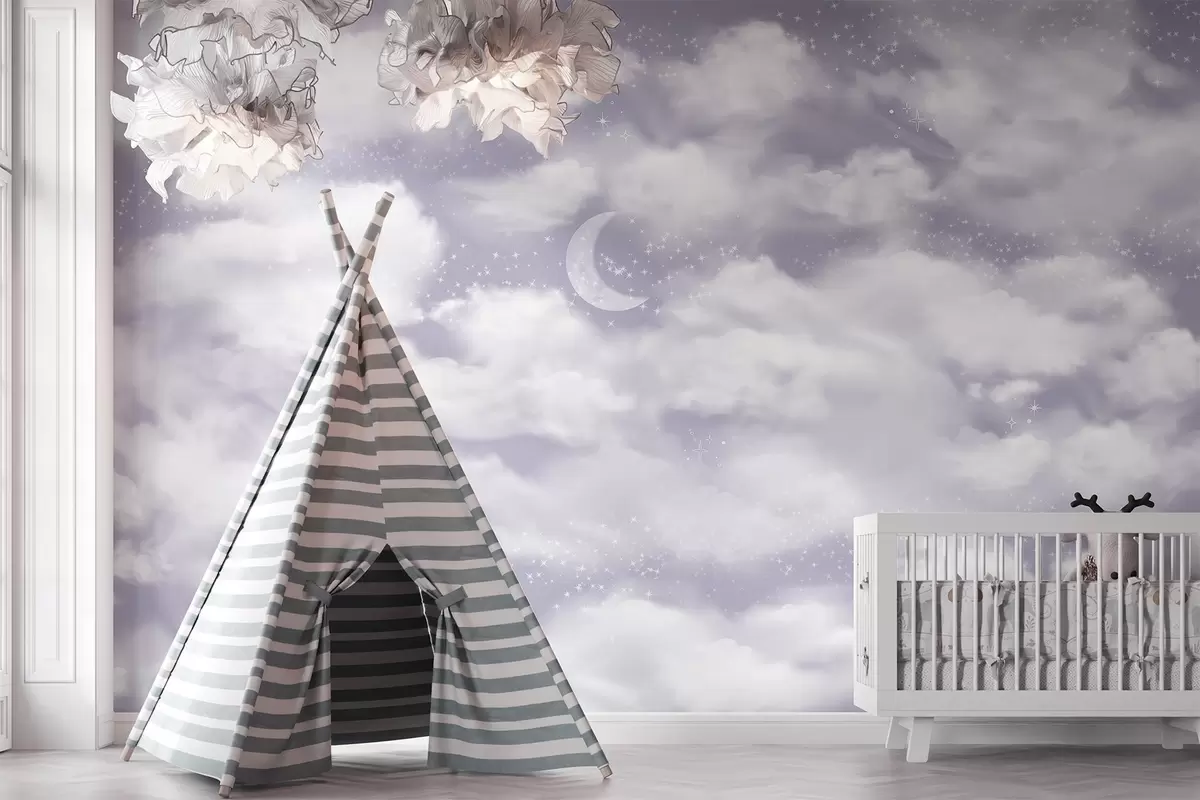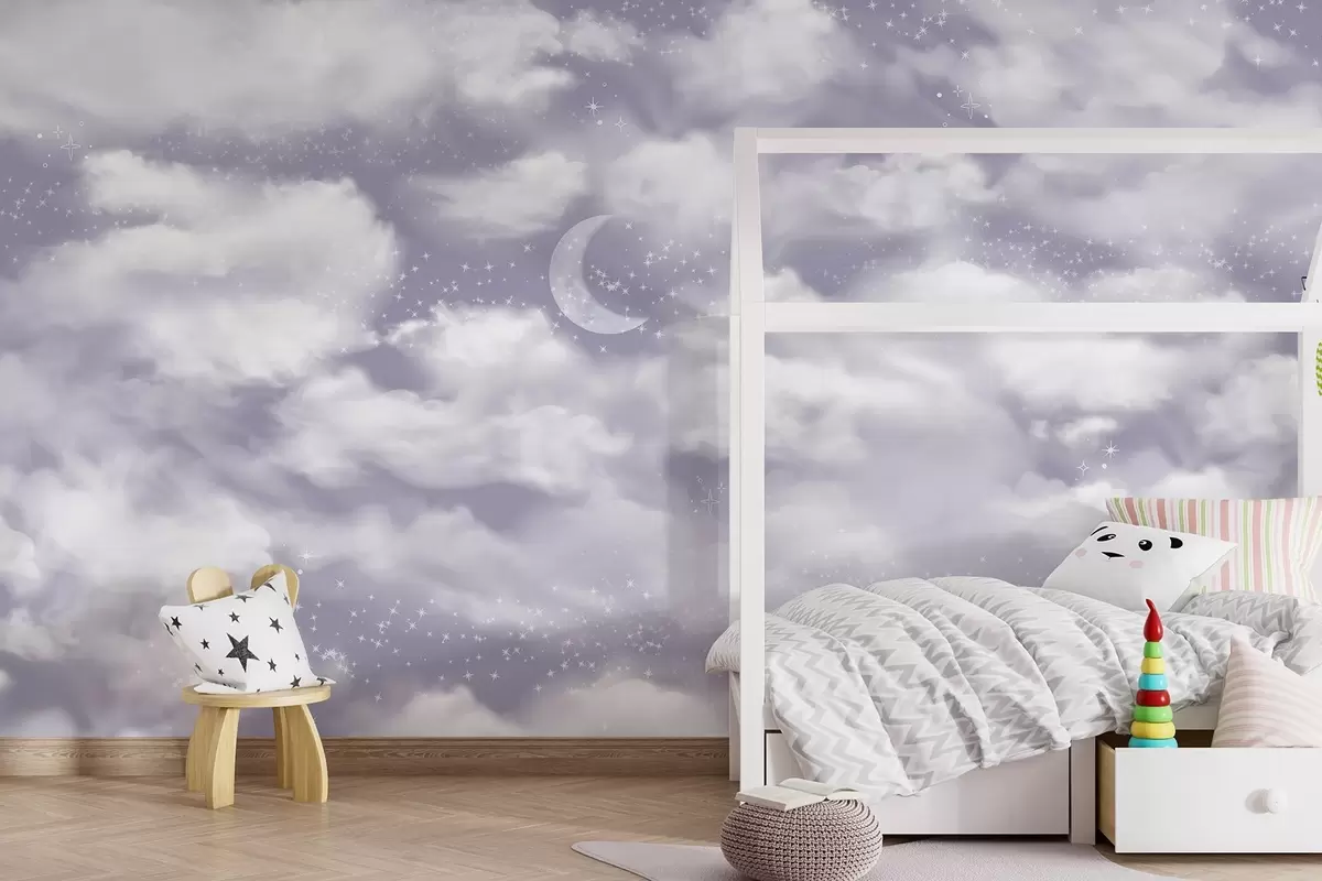 Τοιχογραφίες Έναστρος ουρανός με φεγγάρι και σύννεφα, ονειρικό, αιθέριο, απαλά μοβ χρώματα Nr. w02515v4