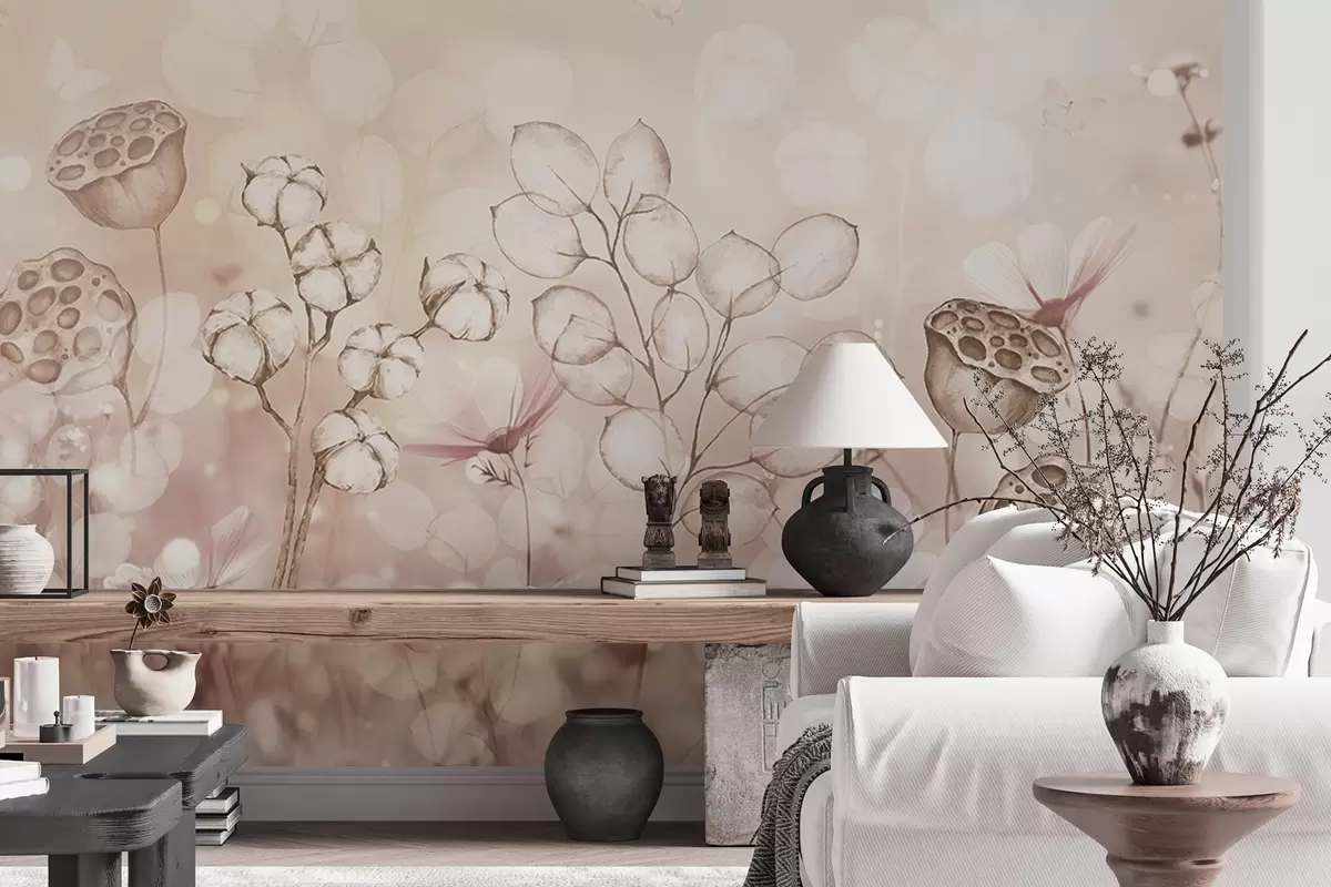 Τοιχογραφίες Ονειρεμένος κήπος με λουλούδια, πεταλούδα, βαμβακερά λουλούδια, λωτοί, μπεζ χρώματα Nr. w02516v3