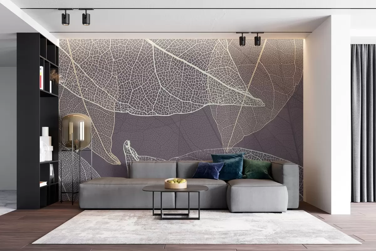 Τοιχογραφίες κοντινό πλάνο φύλλων με φλέβες σε μοβ-γκρι αποχρώσεις Nr. w02520v3