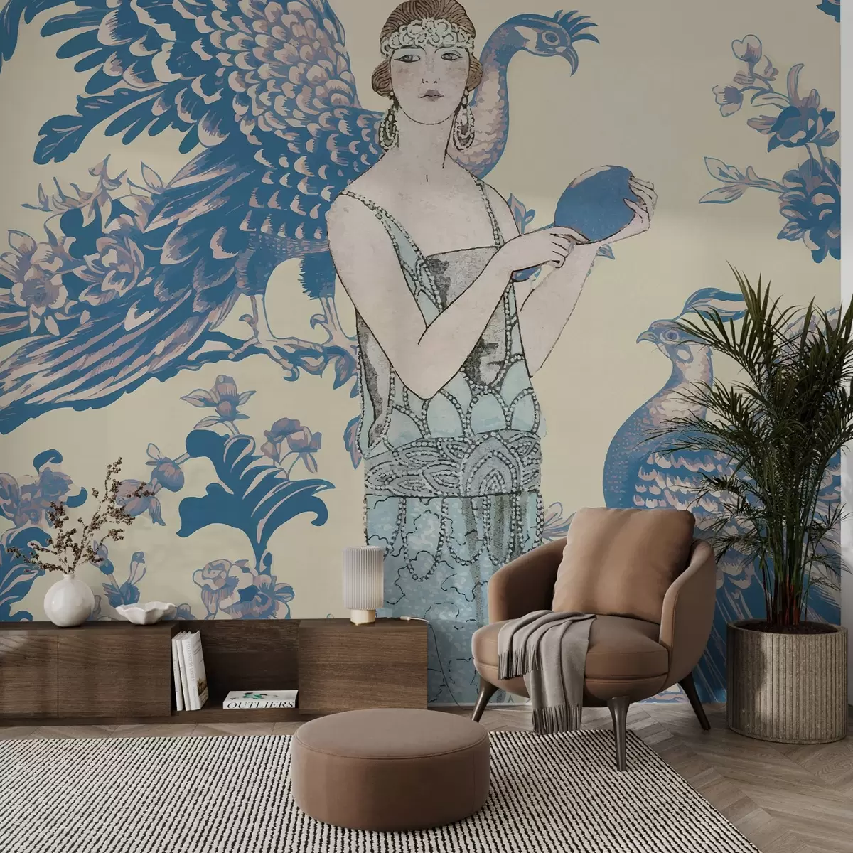 Τοιχογραφίες Κομψό vintage floral μοτίβο με μια γυναίκα σε μπλε και ροζ αποχρώσεις Nr. w02532