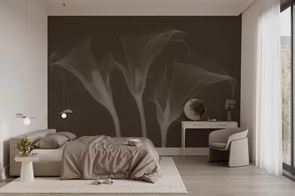 Τοιχογραφίες αέρινα διαφανή λουλούδια Zantedeschia σε σκούρο φόντο Nr. w02632v1