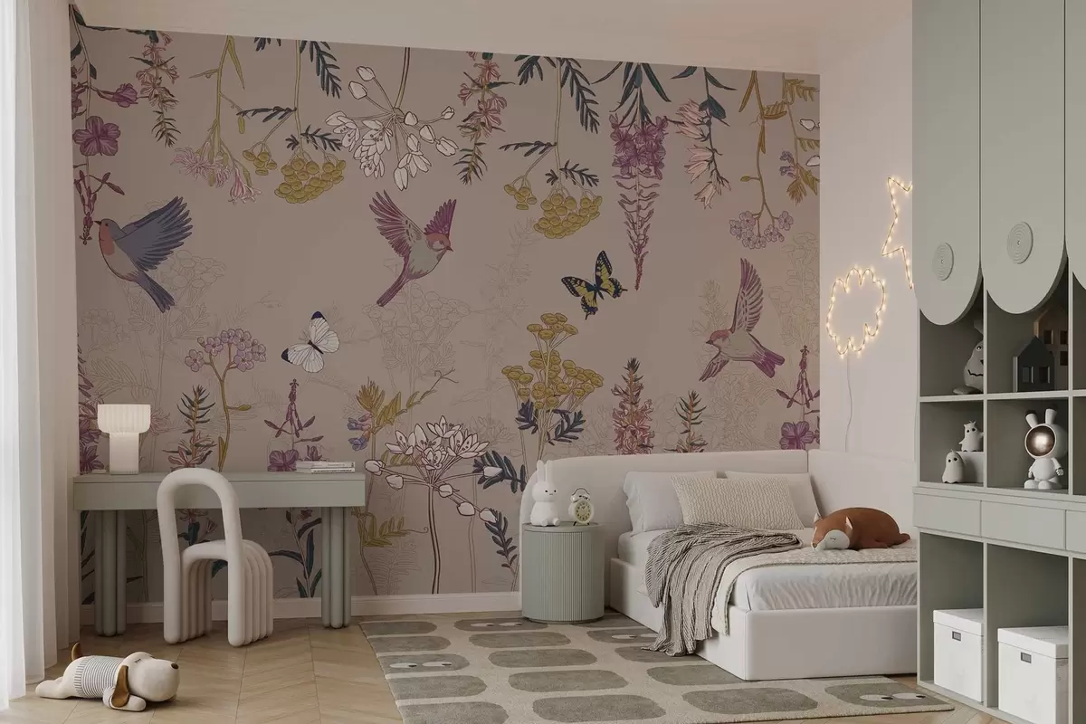 Τοιχογραφίες ένα σύνολο από αγριολούλουδα και πουλιά σε μπεζ φόντο Nr. w02634