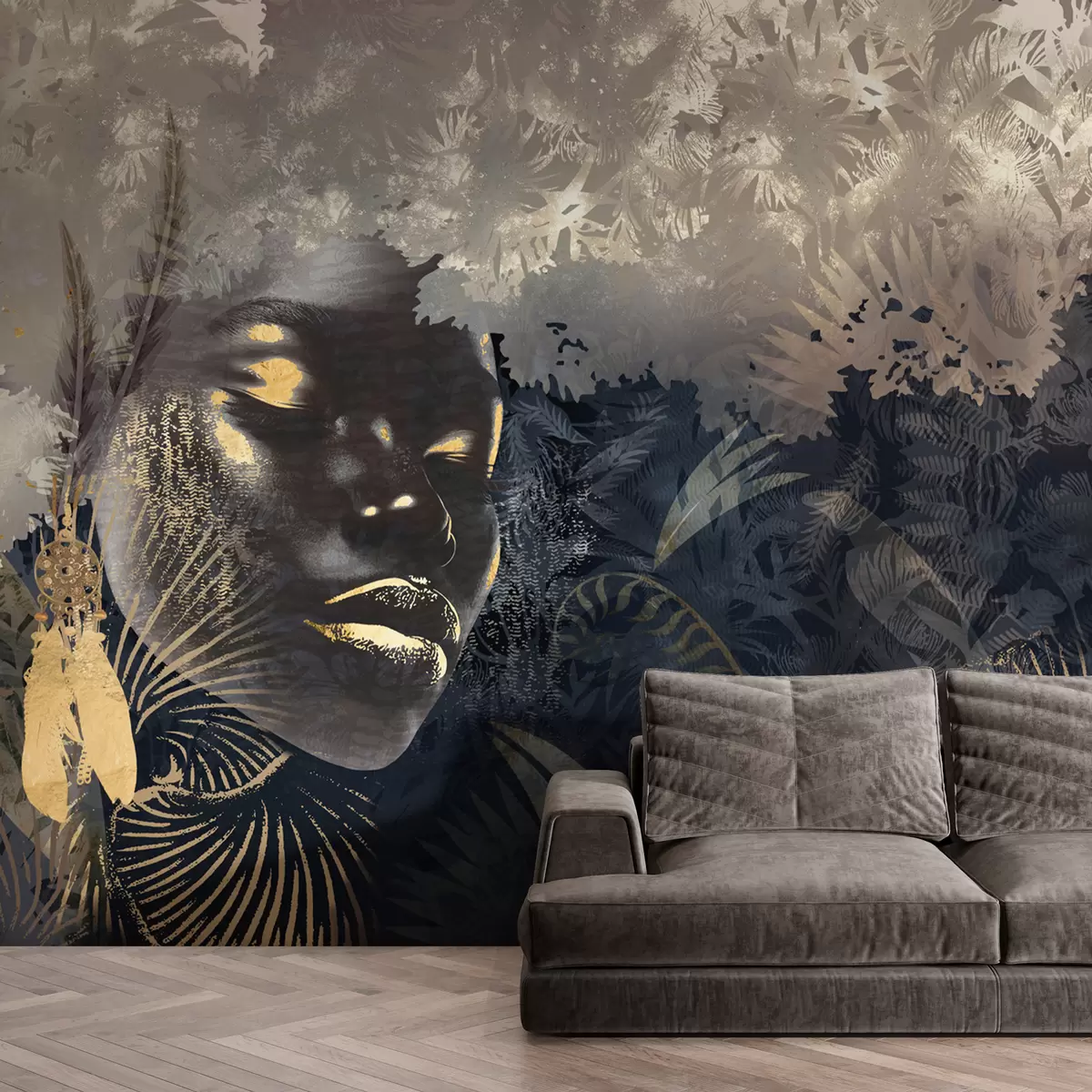Τοιχογραφίες Μαγική Αφρική με τροπικό δάσος, κοριτσίστικα και διανυσματικά στοιχεία με μπλε απόχρωση Nr. w02642v1