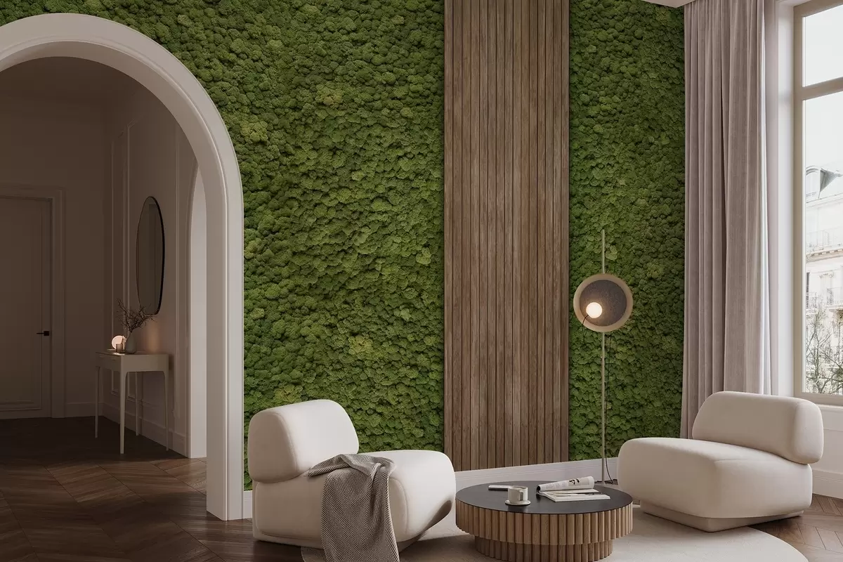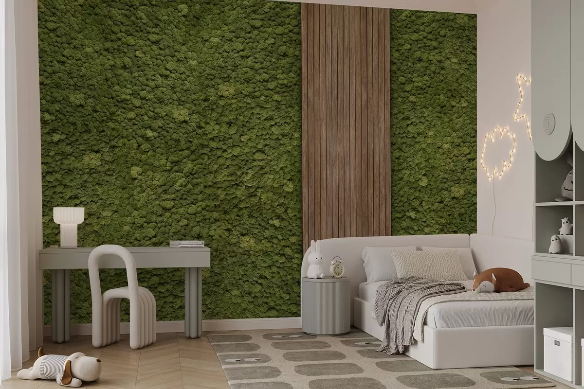 Τοιχογραφίες Τοίχος σε στυλ βρύου με ξύλινο πάνελ, πλούσια χρώματα ελιάς Nr. w02656v3