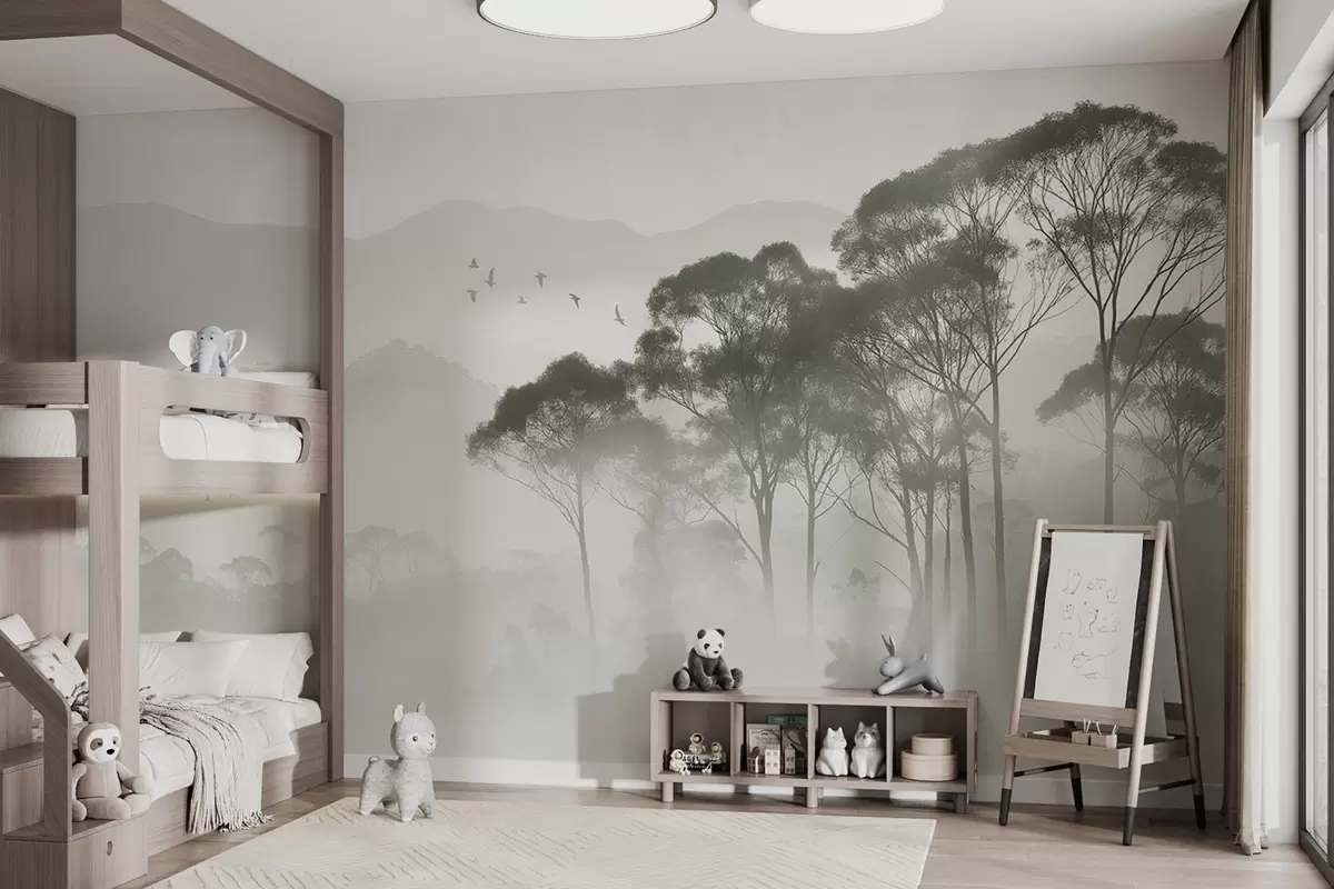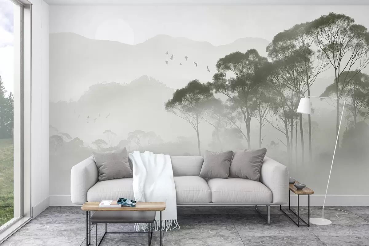Τοιχογραφίες Δέντρα στην ομίχλη, τοπία της φύσης, πουλιά, ήλιος, πράσινα χρώματα Nr. w02740