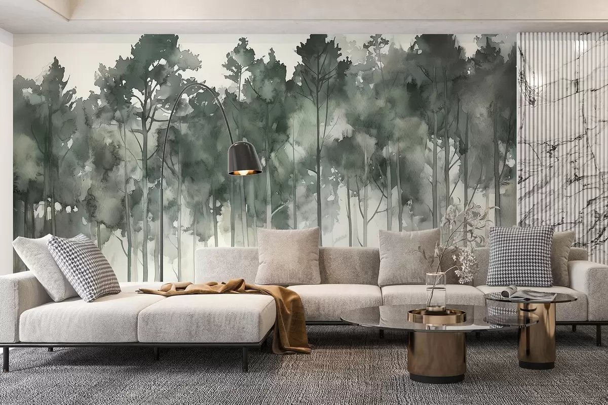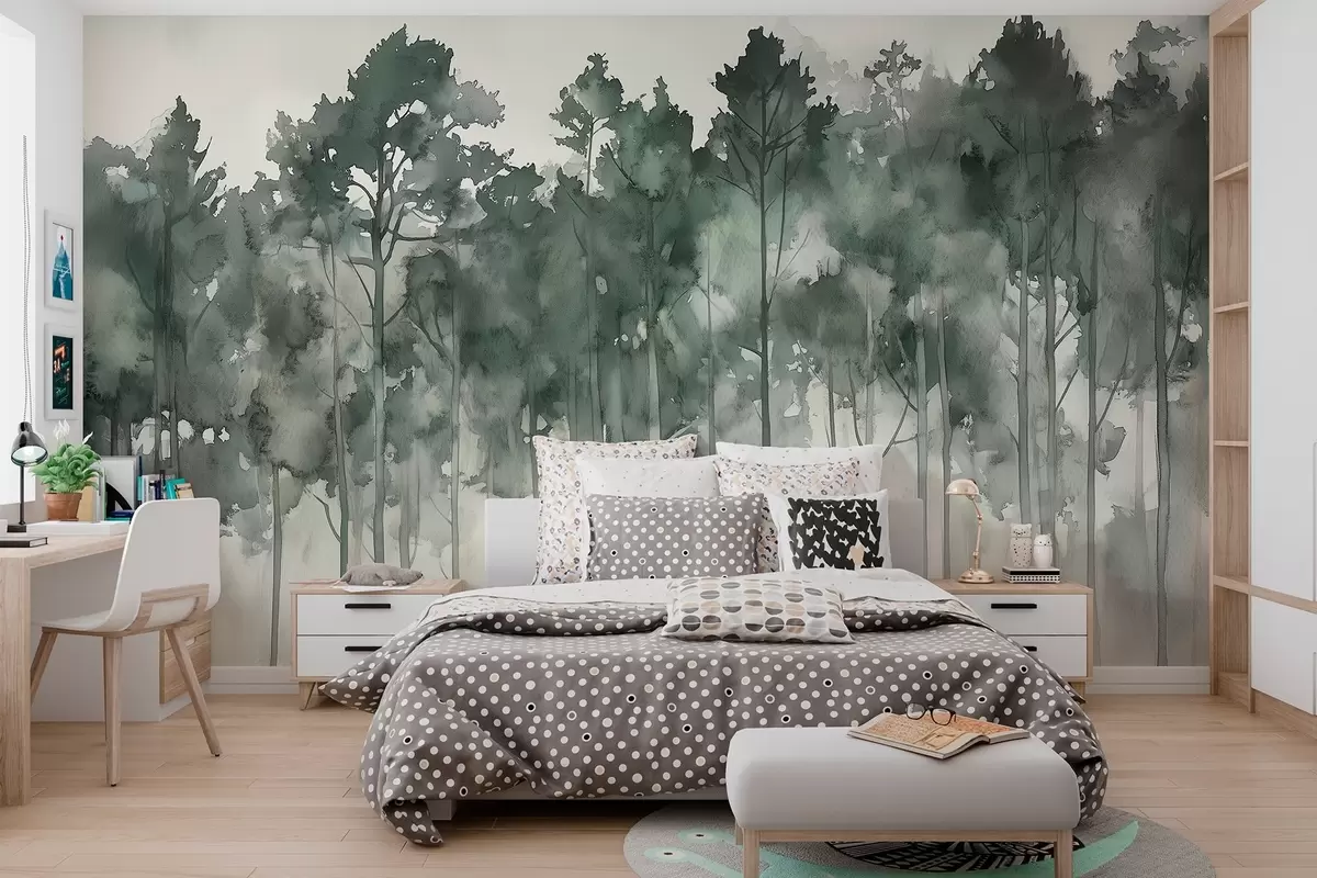 Τοιχογραφίες Ακουαρέλα στυλ δάσος, πεύκα, τοπίο της φύσης, πράσινα χρώματα Nr. w02937