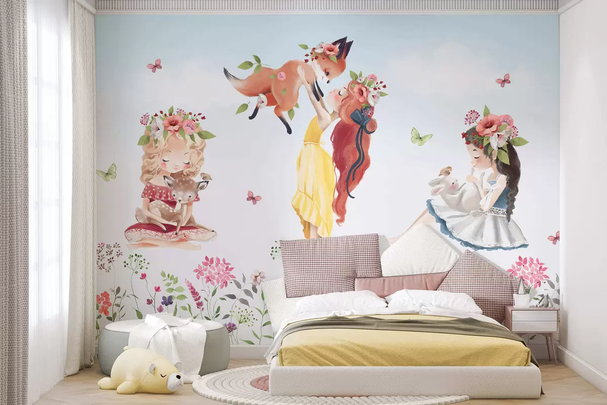 Τοιχογραφίες Κορίτσια με χαριτωμένα ζώα του δάσους Nr. w03002