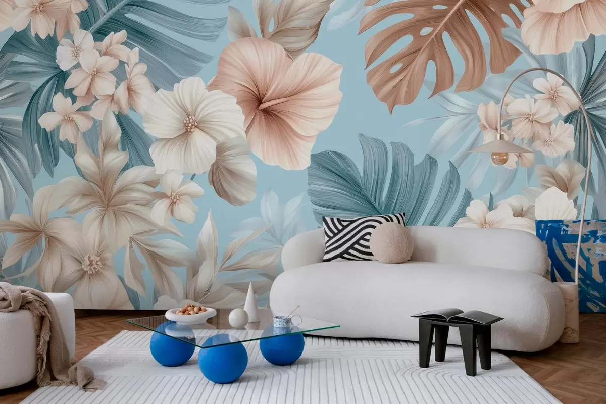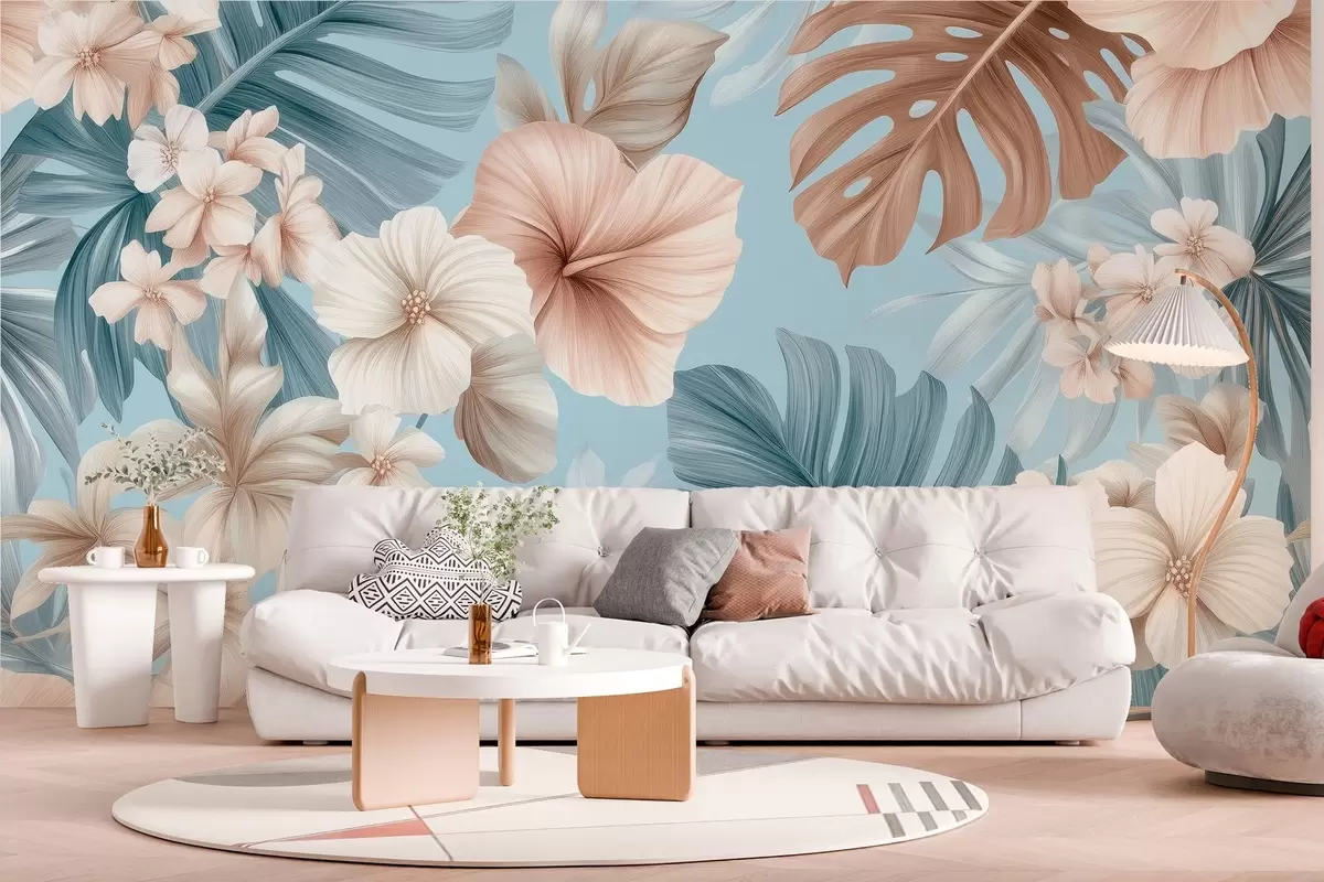 Τοιχογραφίες τροπικό σχέδιο με μεγάλα φύλλα και λουλούδια σε παστέλ μπλε και μπεζ χρώματα Nr. w03013