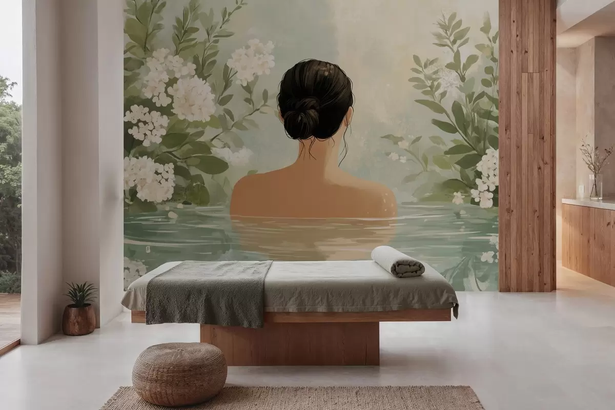 Τοιχογραφίες μια γαλήνια και ονειρική βοτανική απεικόνιση μιας γυναίκας που κάνει μπάνιο σε μια ήρεμη, αντανακλαστική υδάτινη επιφάνεια, περιτριγυρισμένη από πλούσια βλάστηση και λεπτά λευκά λουλούδια. Nr. w03014