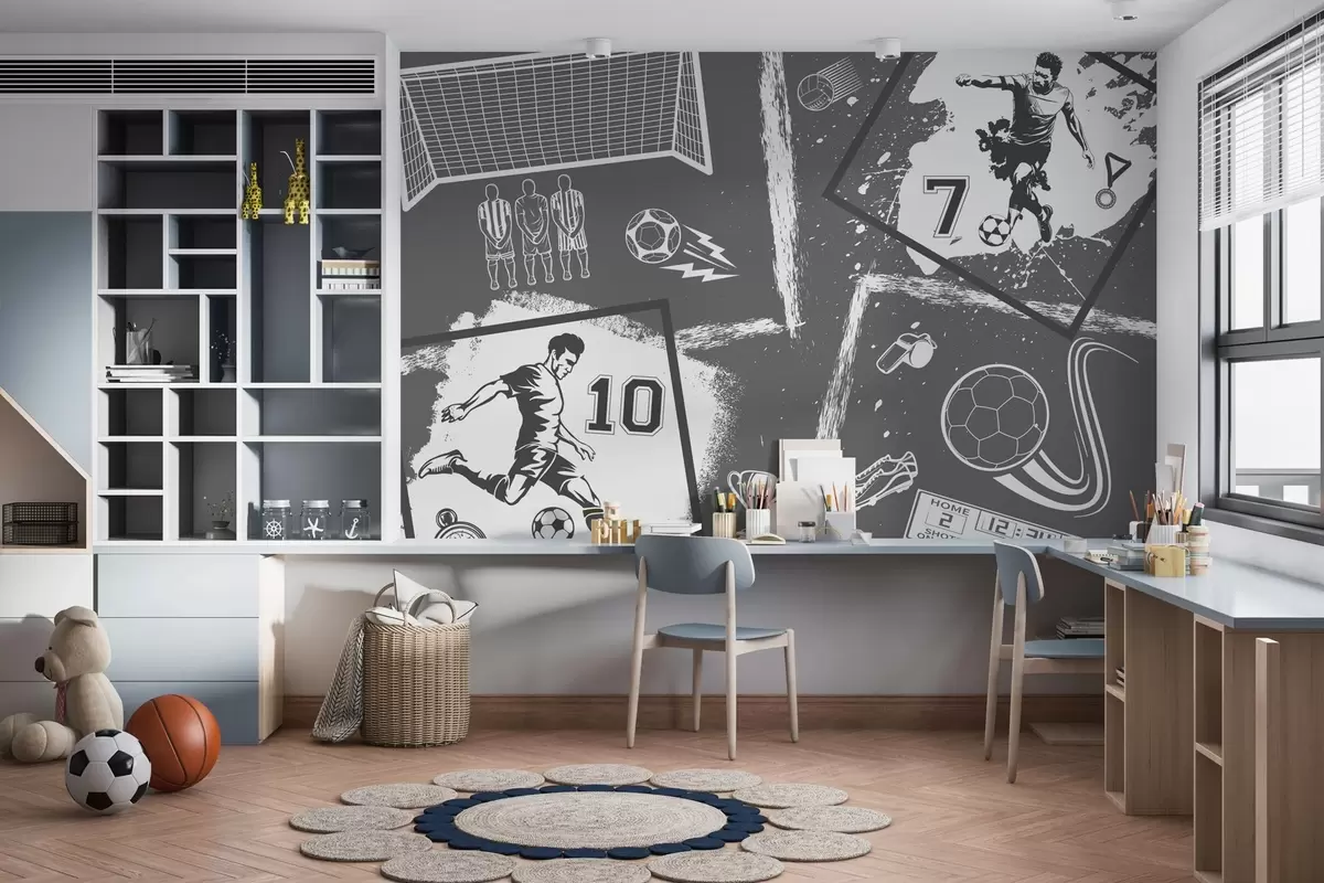 Τοιχογραφίες Ποδοσφαιριστές, μπάλα και άλλα χαρακτηριστικά ποδοσφαίρου σε γκρι τόνους Nr. w03122v1