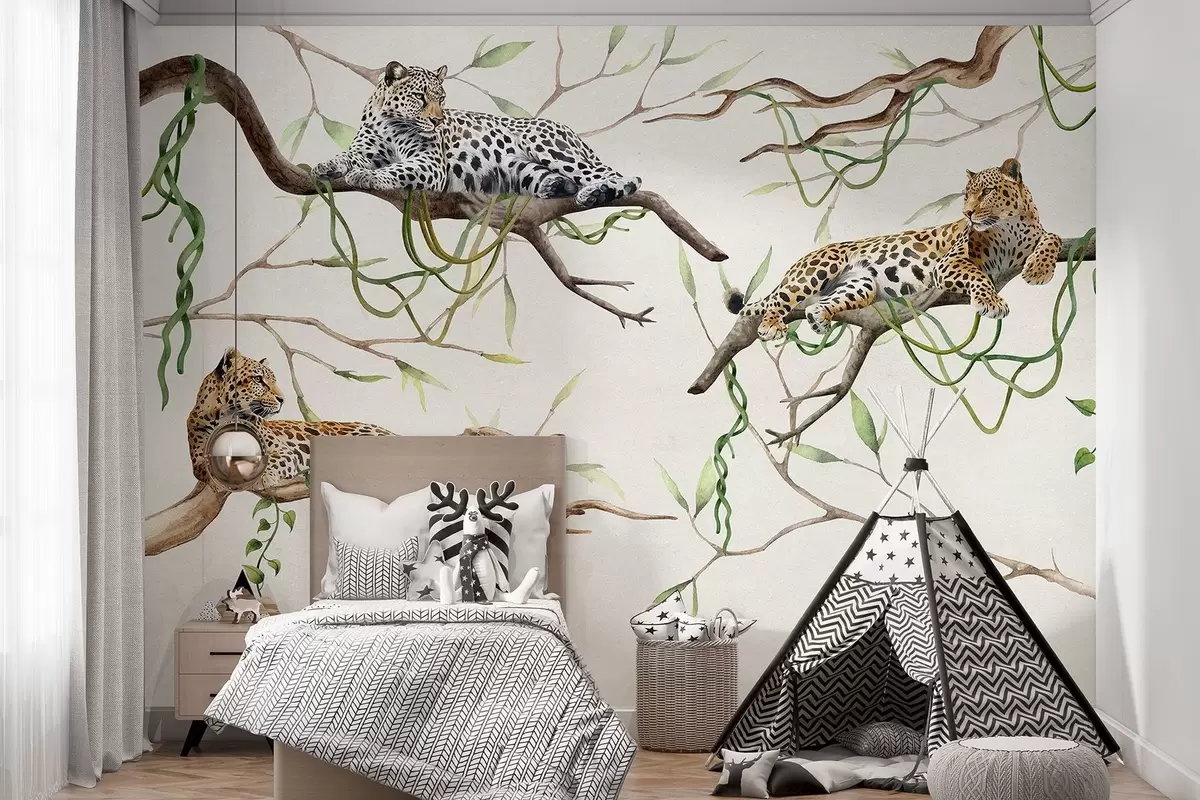 Τοιχογραφίες Λεοπαρδάλεις στα δέντρα της ζούγκλας, λιάνες, τροπικά, άγρια ζώα, φυσική παλέτα χρωμάτων Nr. w03146