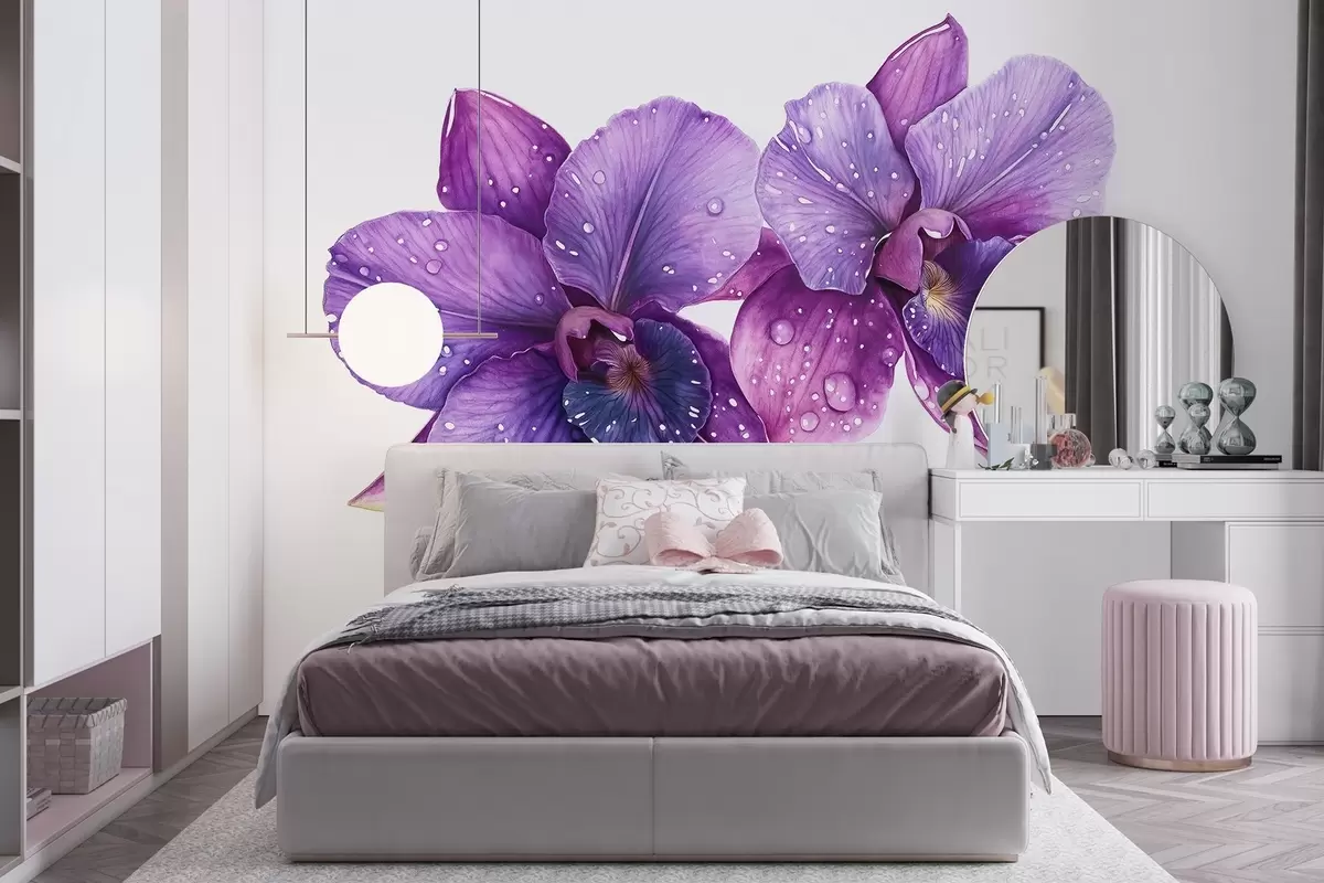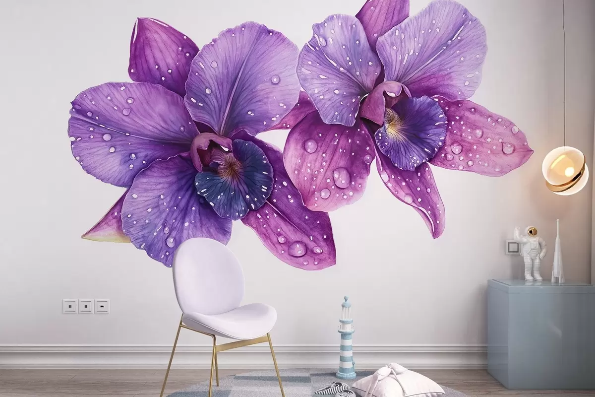 Τοιχογραφίες Όμορφα λουλούδια ορχιδέας, σχέδιο σε στυλ υδατογραφίας, βιολετί χρώματα Nr. w03164