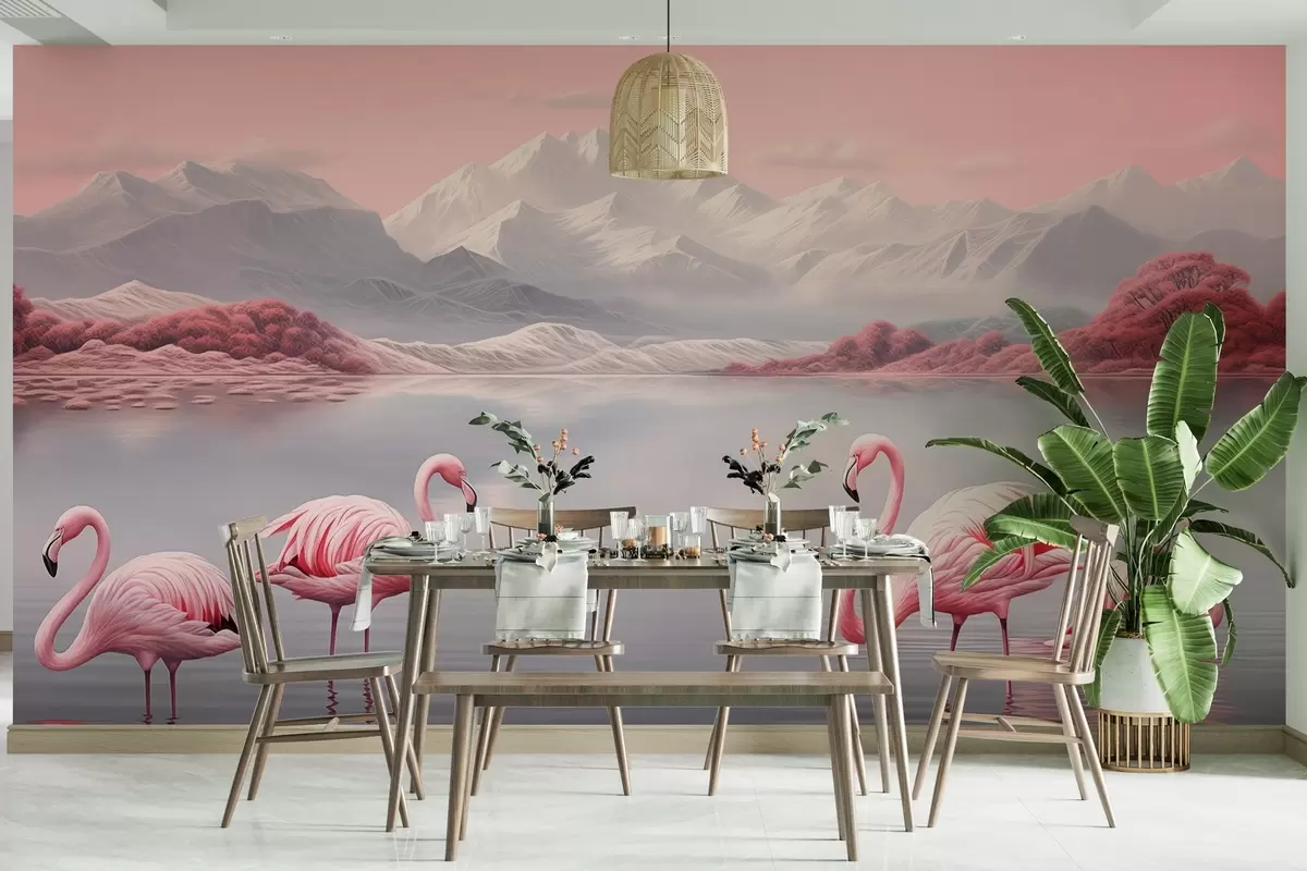 Τοιχογραφίες Ακουαρέλα με θέα βουνά με φλαμίνγκο Nr. w03211