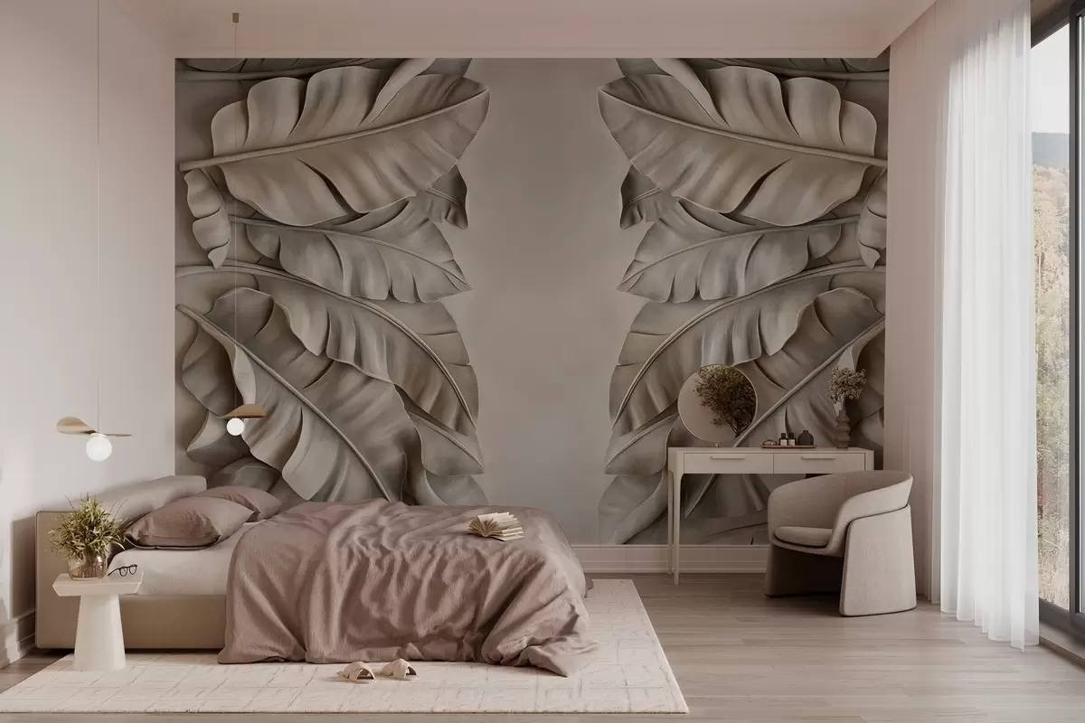 Τοιχογραφίες απομίμηση ανάγλυφου με τροπικά φύλλα σε μπεζ τόνους Nr. w03285