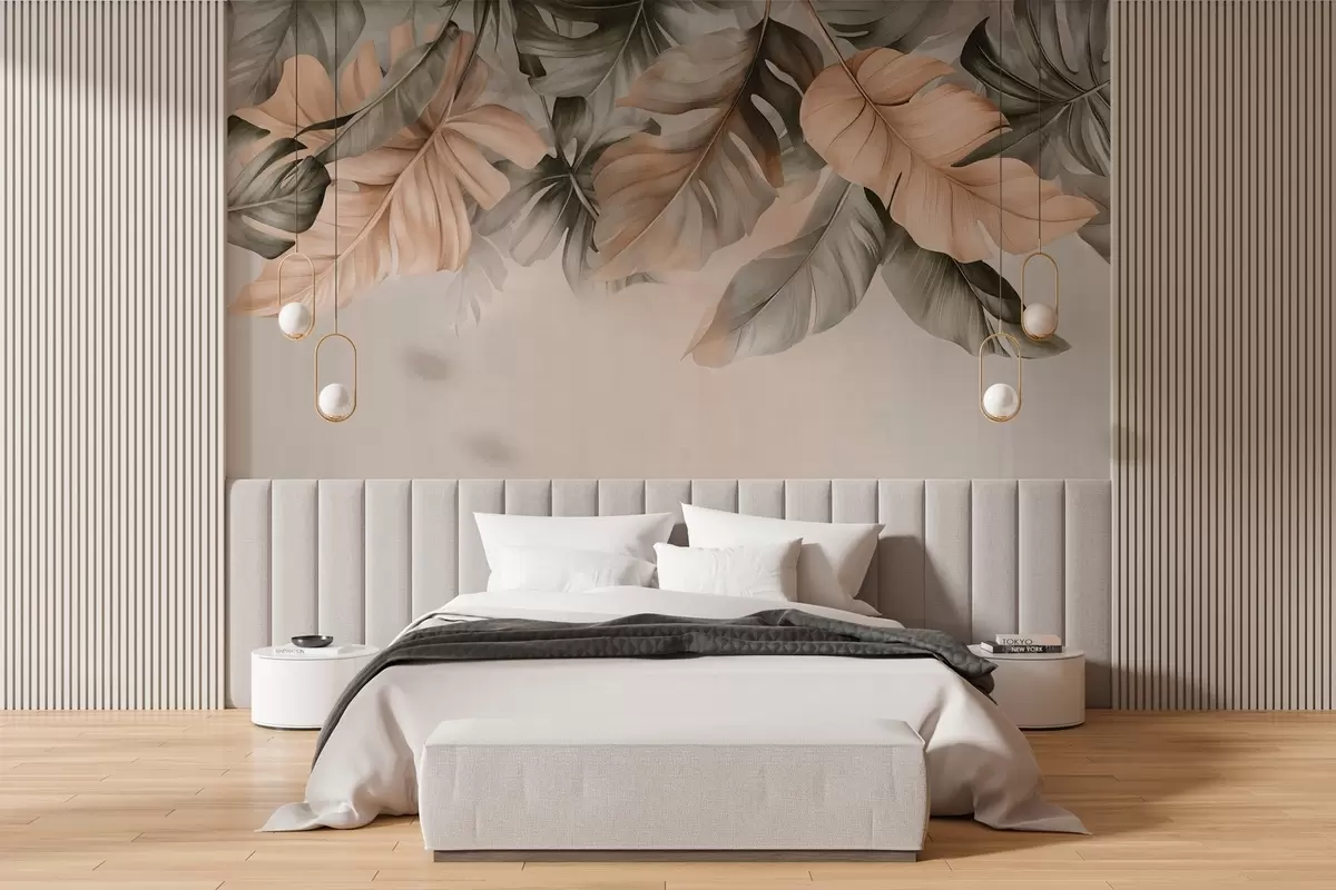 Τοιχογραφίες Τροπικά φύλλα που κρέμονται από την κορυφή, σε ένα φόντο με υφή Nr. w03290