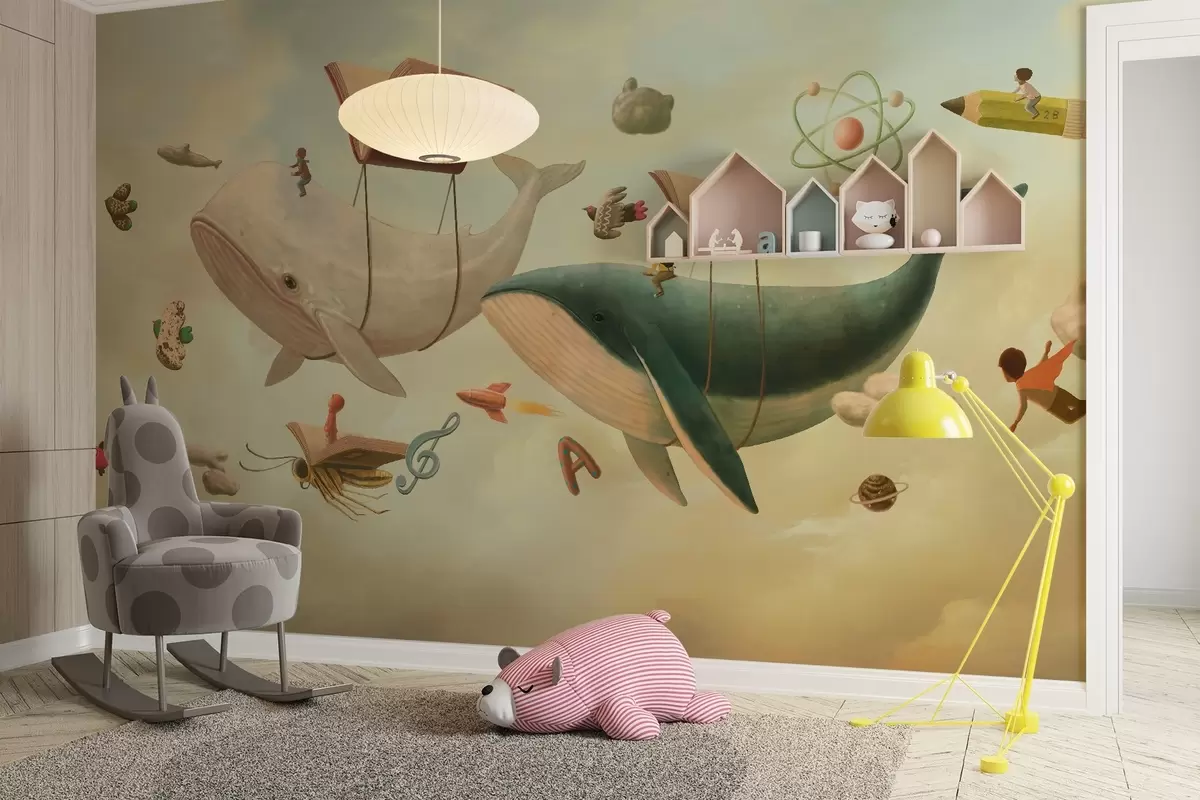 Τοιχογραφίες Μια ιδιόρρυθμη απεικόνιση φαλαινών που πετούν στον ουρανό κάτω από μπαλόνια σε σχήμα βιβλίου Nr. w03327v1