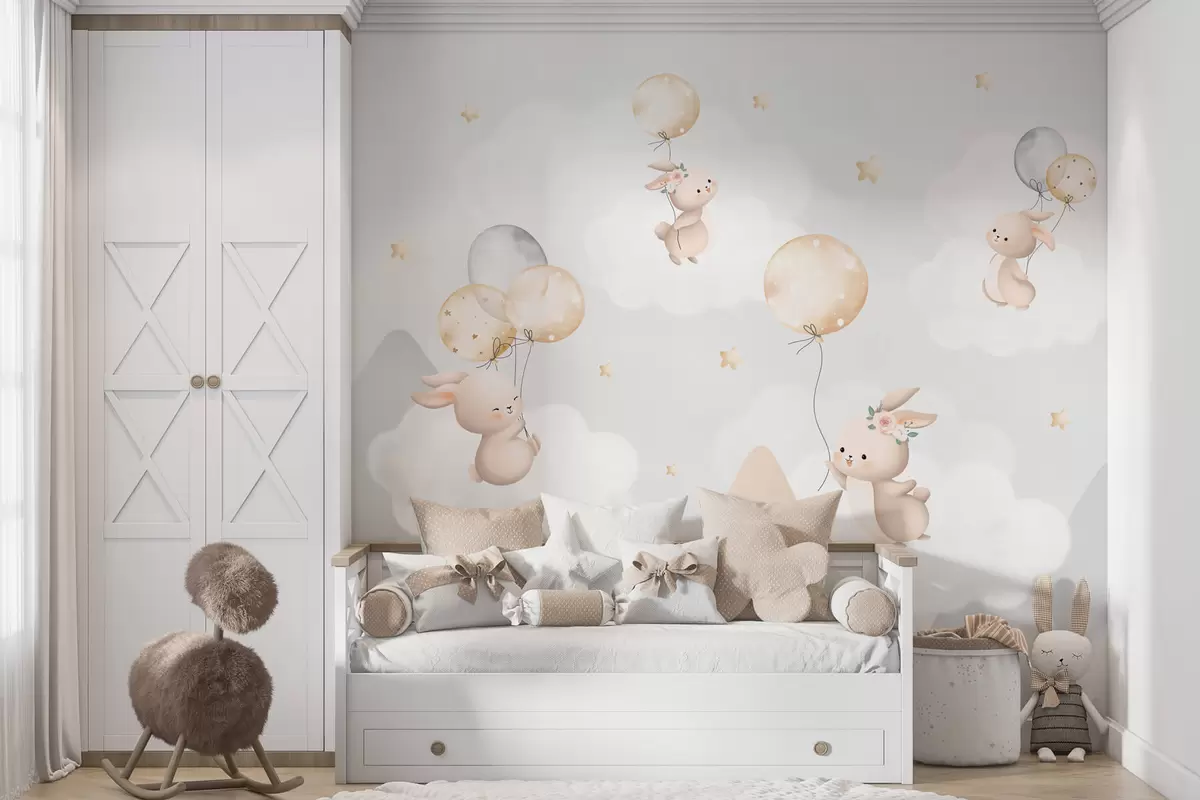 Τοιχογραφίες Λαγουδάκια με μπαλόνια σε σύννεφα ανάμεσα σε βουνοκορφές Nr. w03375v1