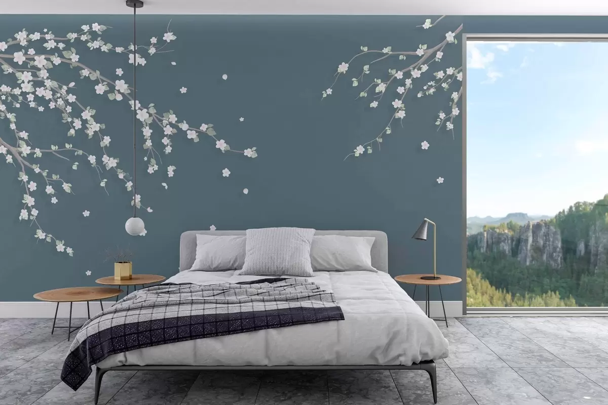 Τοιχογραφίες Ανθισμένο κλαδί στο φόντο ενός τοίχου σε μπλε στυλ grunge Nr. w03393v1