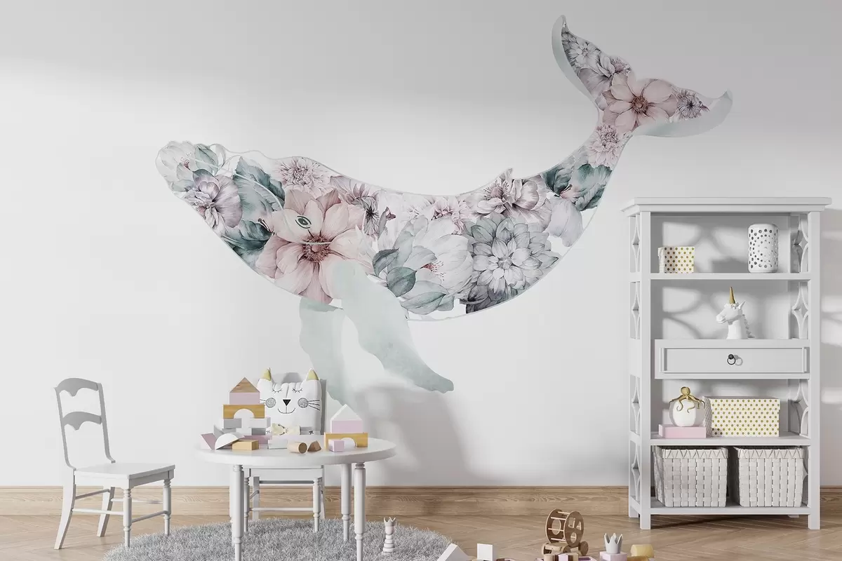 Τοιχογραφίες Όμορφη φάλαινα με νερομπογιές λουλούδια, θαλάσσια ζώα Nr. w03445v1