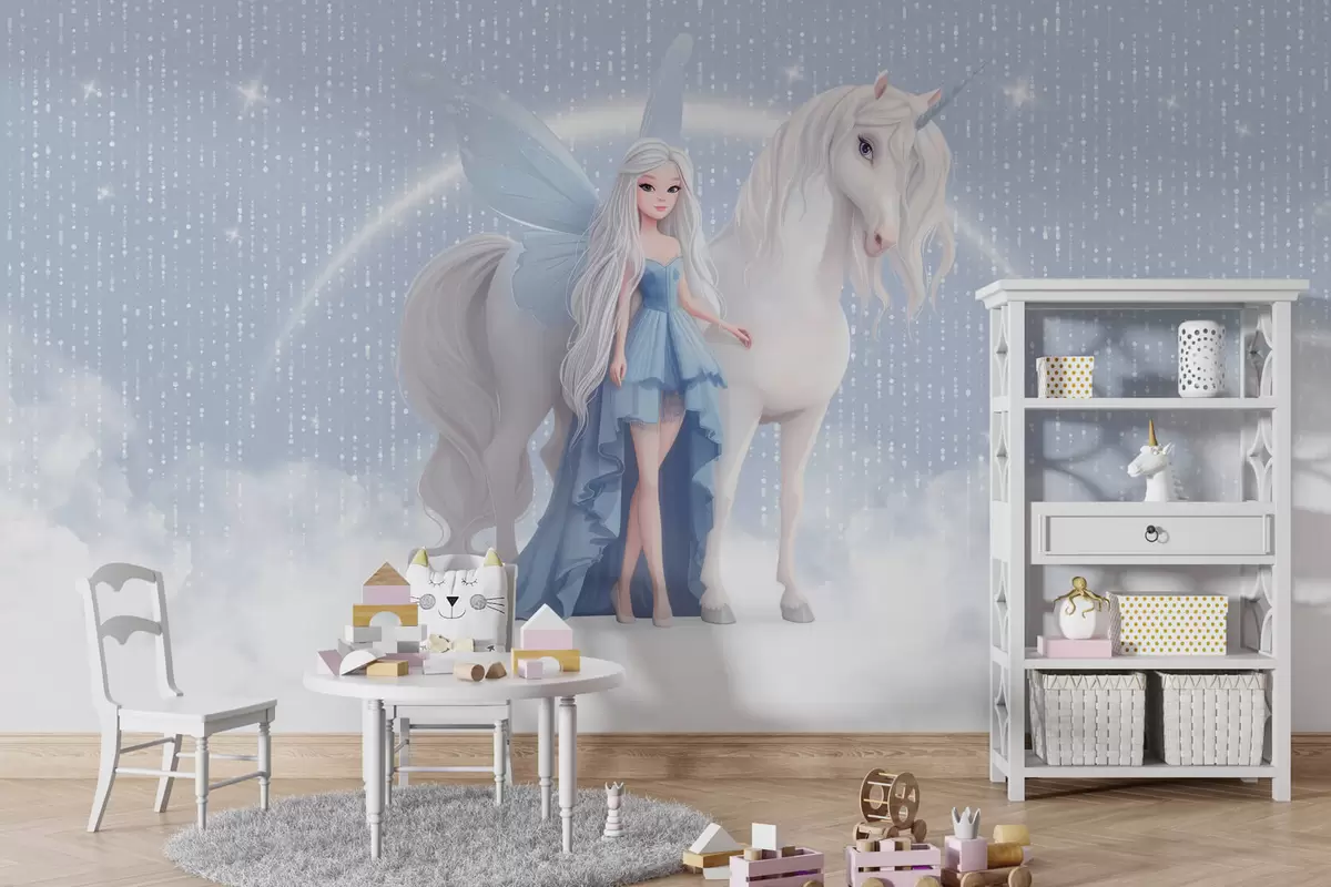 Τοιχογραφίες Μια νεράιδα με έναν μονόκερο ανάμεσα στα σύννεφα Nr. w03527v1