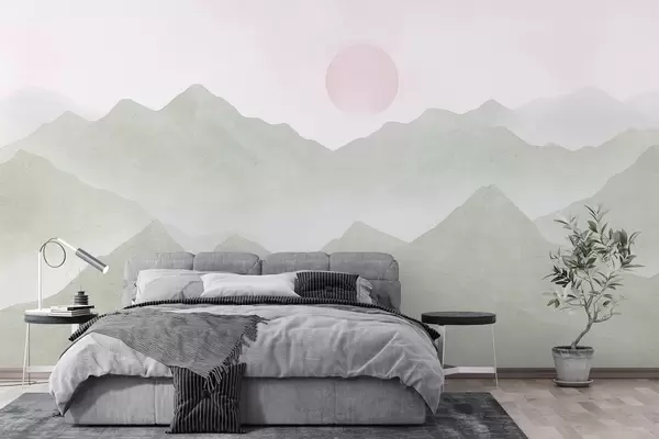 Τοιχογραφίες Boho στυλ βουνά τοπίο, ηλιοβασίλεμα, μαλακό παστέλ, πράσινο Nr. w03547