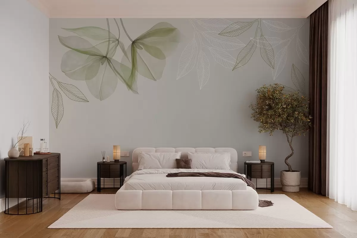 Τοιχογραφίες λεπτεπίλεπτα ημιδιαφανή λουλούδια και φύλλα σε χακί αποχρώσεις Nr. w03616v2
