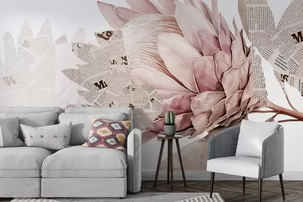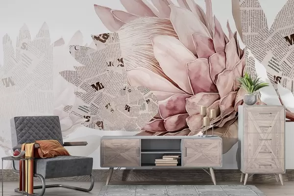 Τοιχογραφίες Πρωτέα λουλούδια, τέχνη εφημερίδων, floral, τροπικά, παστέλ μπεζ χρώματα Nr. w03667v4