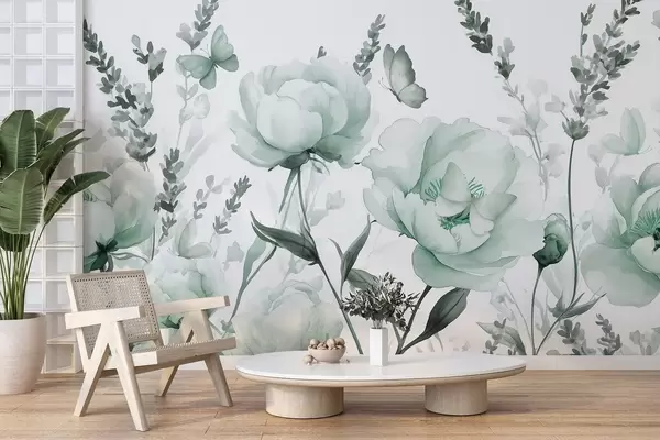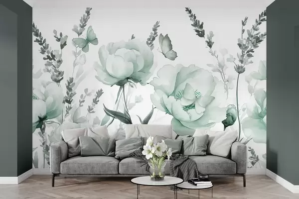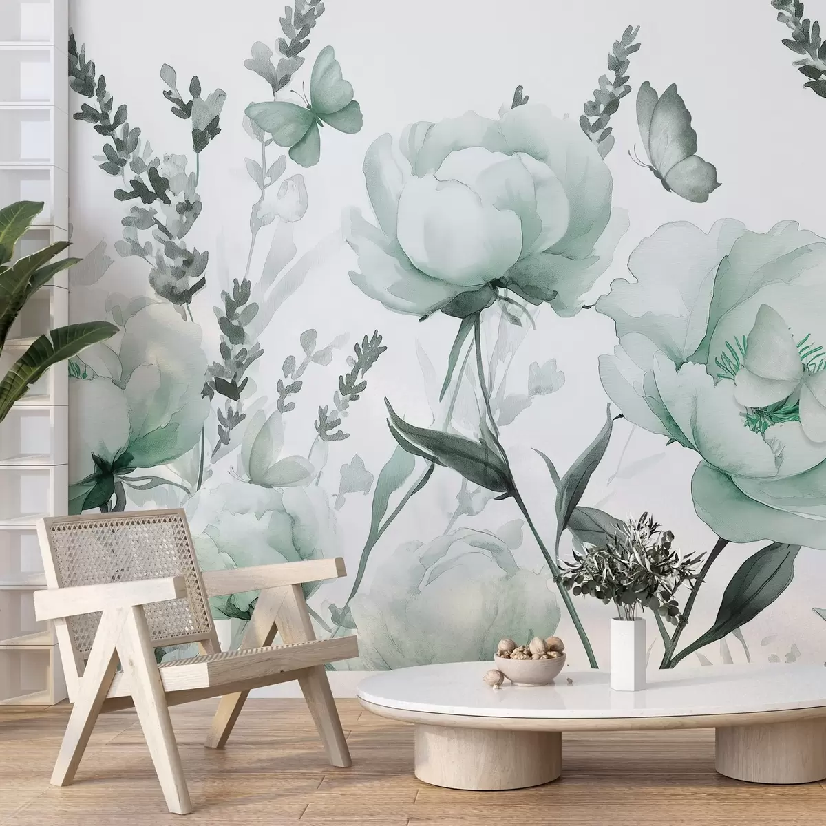 Τοιχογραφίες Λουλούδι λιβάδι, παιώνιες, λεβάντα, πεταλούδες, στυλ υδατογραφίας, πράσινα χρώματα Nr. w03668v1