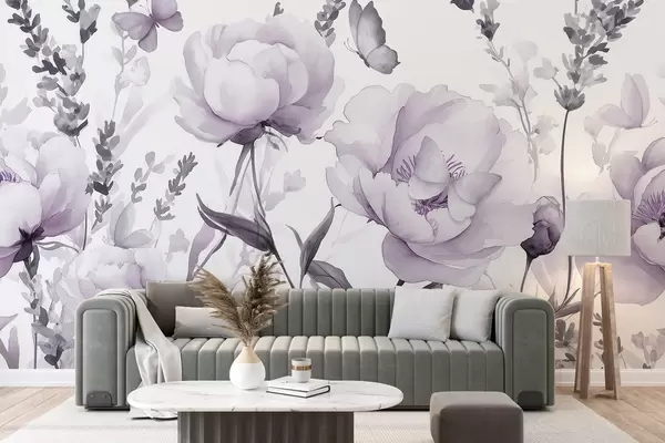 Τοιχογραφίες Λουλούδι λιβάδι, παιώνιες, λεβάντα, πεταλούδες, ακουαρέλα στυλ, μαθήτρια χρώματα Nr. w03668v3