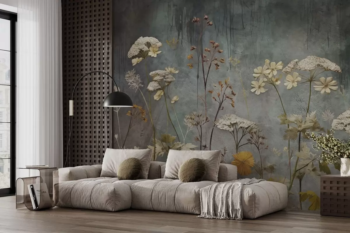 Τοιχογραφίες Άγρια λουλούδια και χόρτα στο φόντο του τοίχου grunge Nr. w03697