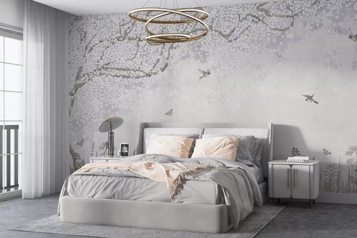 Τοιχογραφίες Ανθισμένο δέντρο με αγριολούλουδα και πουλιά Nr. w03700