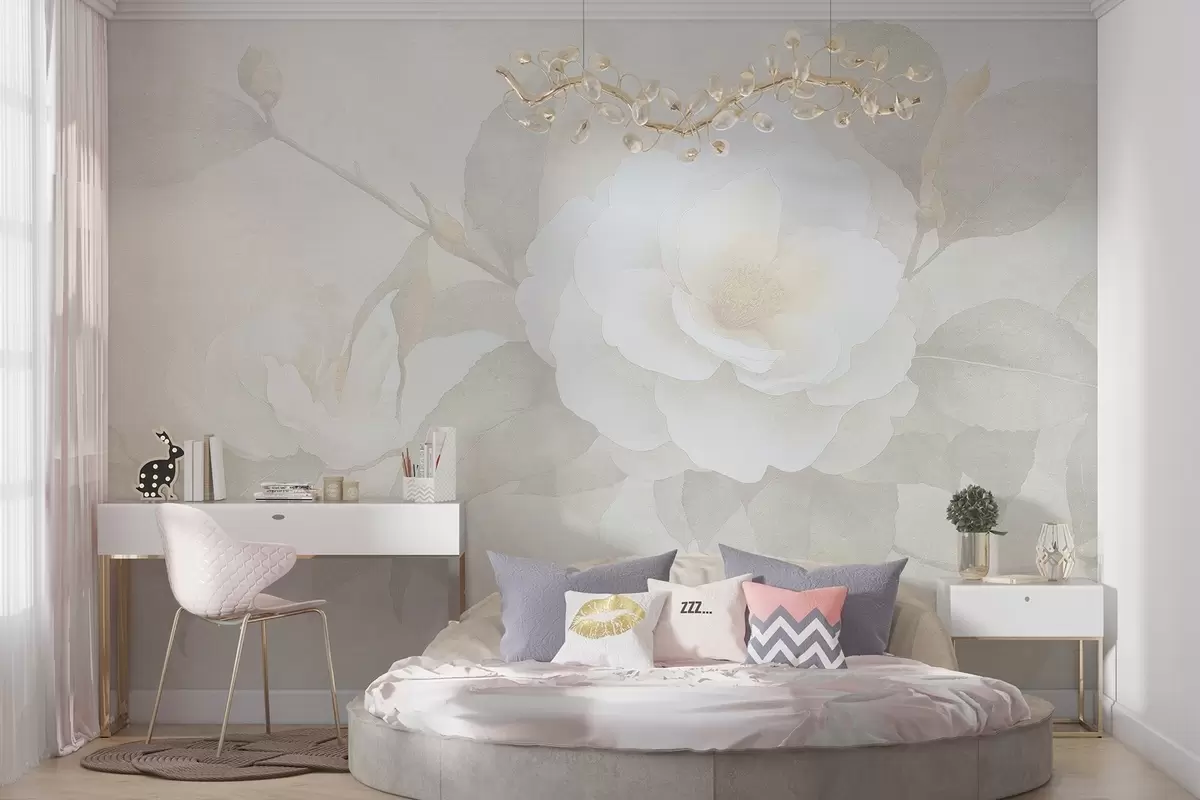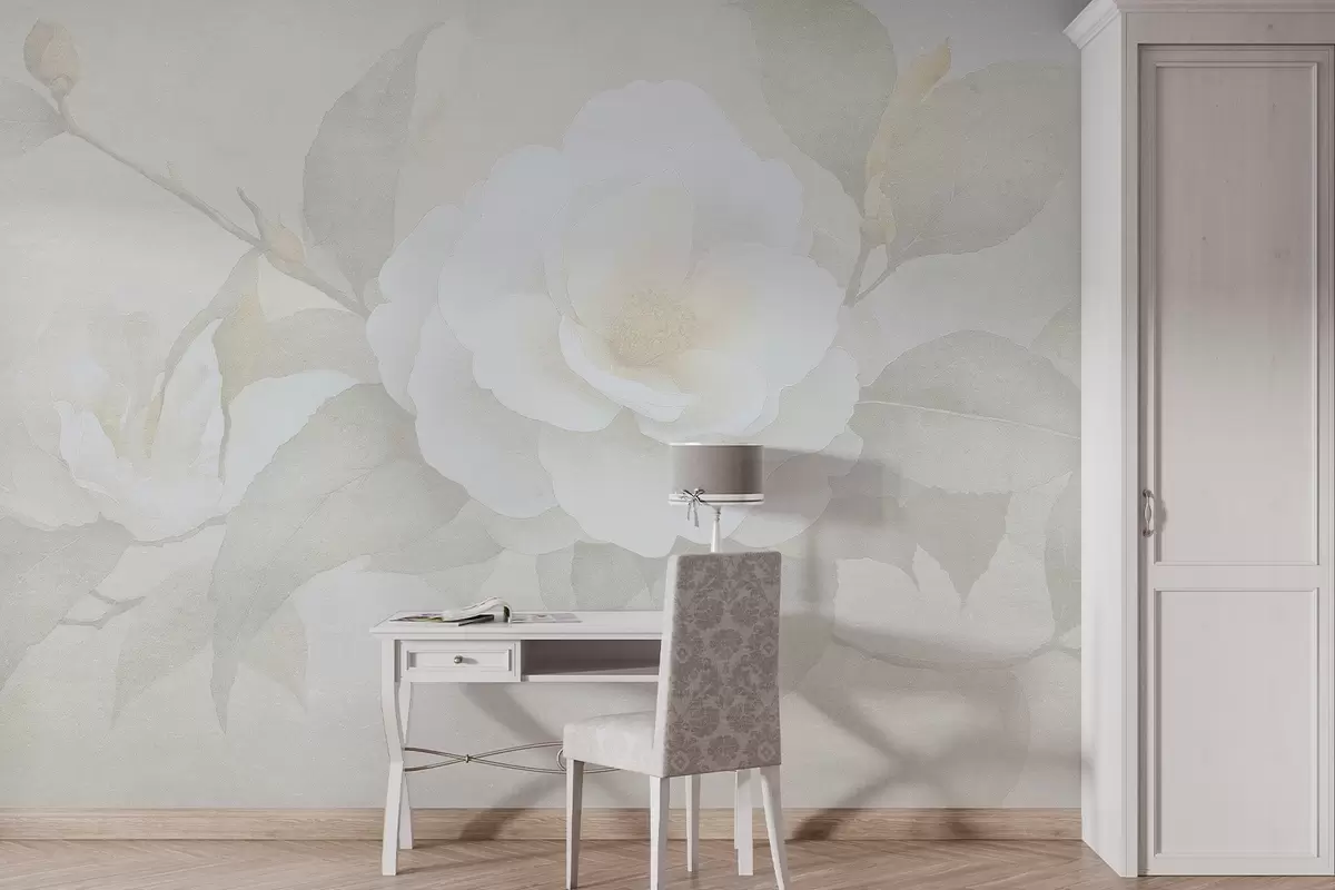 Τοιχογραφίες Απαλό παστέλ με λουλούδια καμέλιας στο κλαδί, μπεζ χρώματα Nr. w03760