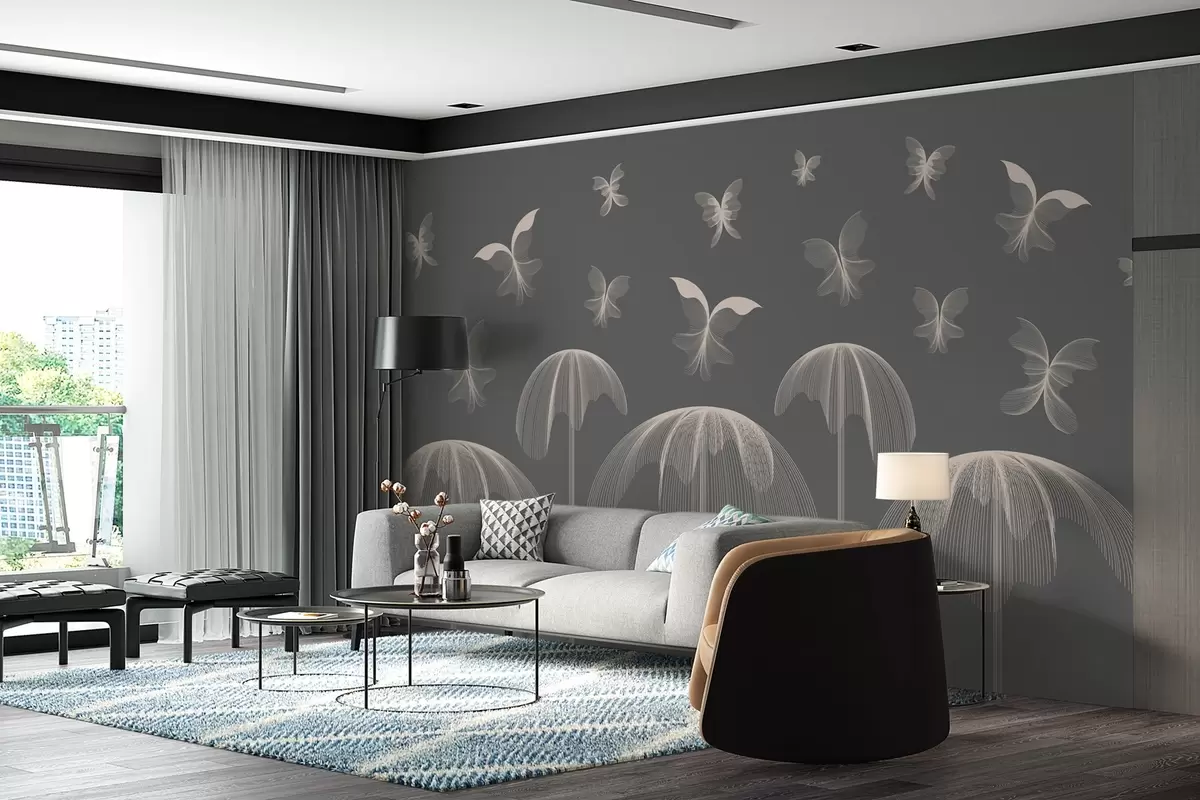 Τοιχογραφίες μινιμαλιστική γραμμική ταπετσαρία πεταλούδες και σιντριβάνια σε σκούρο γκρι φόντο Nr. w03762v1