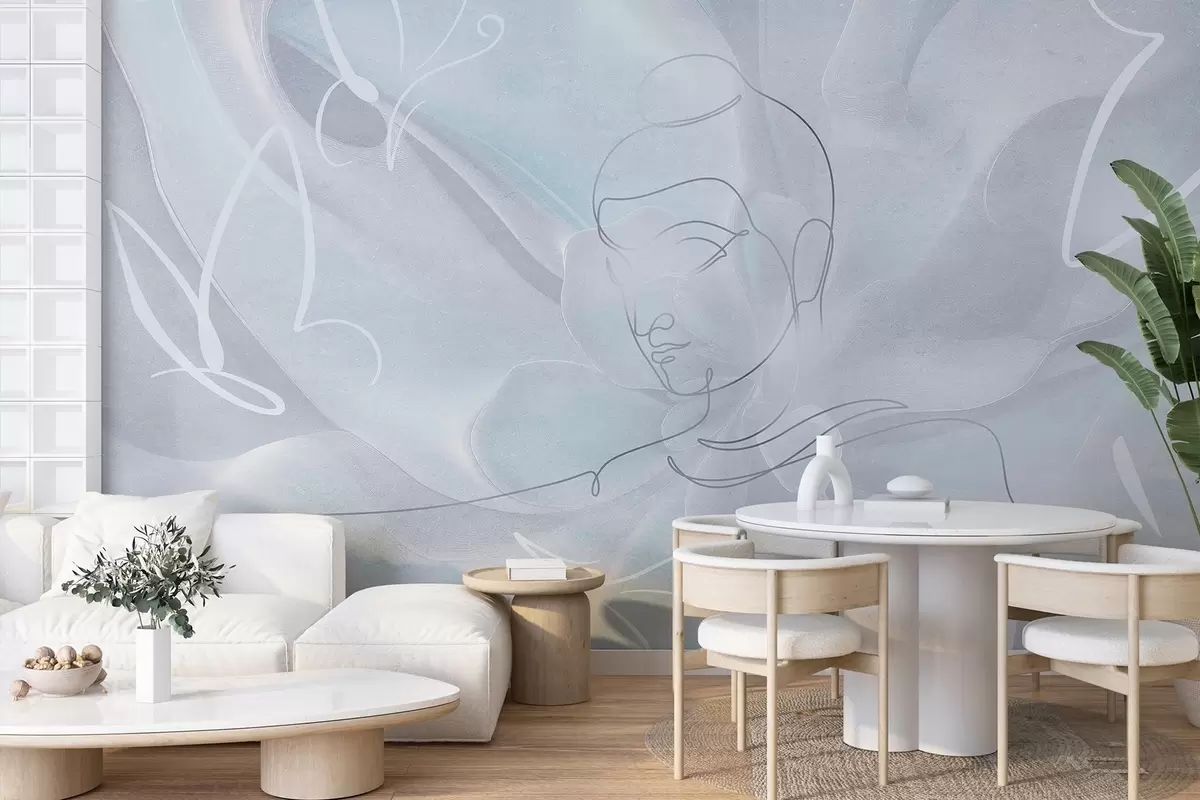 Τοιχογραφίες Floral αφαίρεση με Βούδα σχέδιο γραμμή, μπλε χρώματα Nr. w04004v1