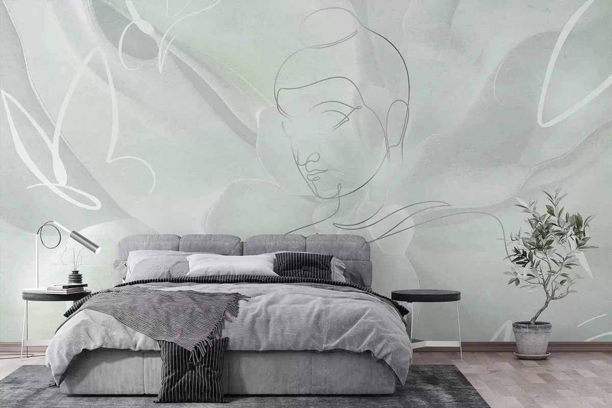 Τοιχογραφίες Floral αφαίρεση με Βούδα σχέδιο γραμμή, πράσινα χρώματα Nr. w04004v3