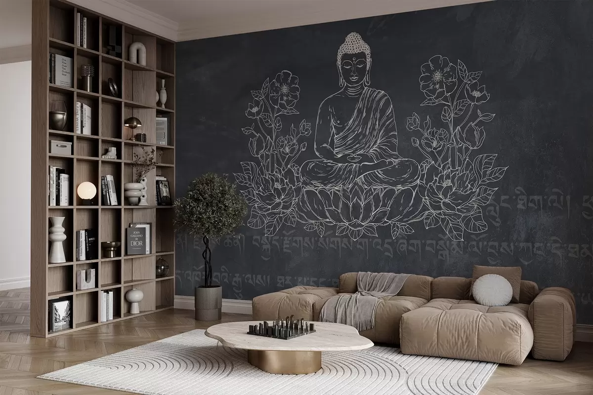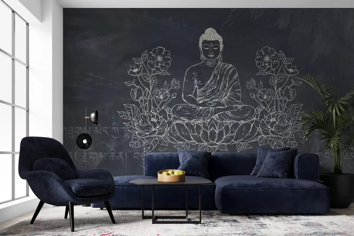 Τοιχογραφίες Διαλογισμός Βούδα με λουλούδια λωτού, γραμμή τέχνης, ανατολίτικη, σκούρο φόντο Nr. w04008