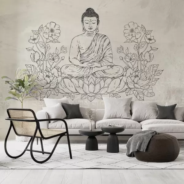 Τοιχογραφίες Διαλογισμός Βούδα με λουλούδια λωτού, γραμμή τέχνης, ανατολίτικη, μπεζ φόντο Nr. w04008v1