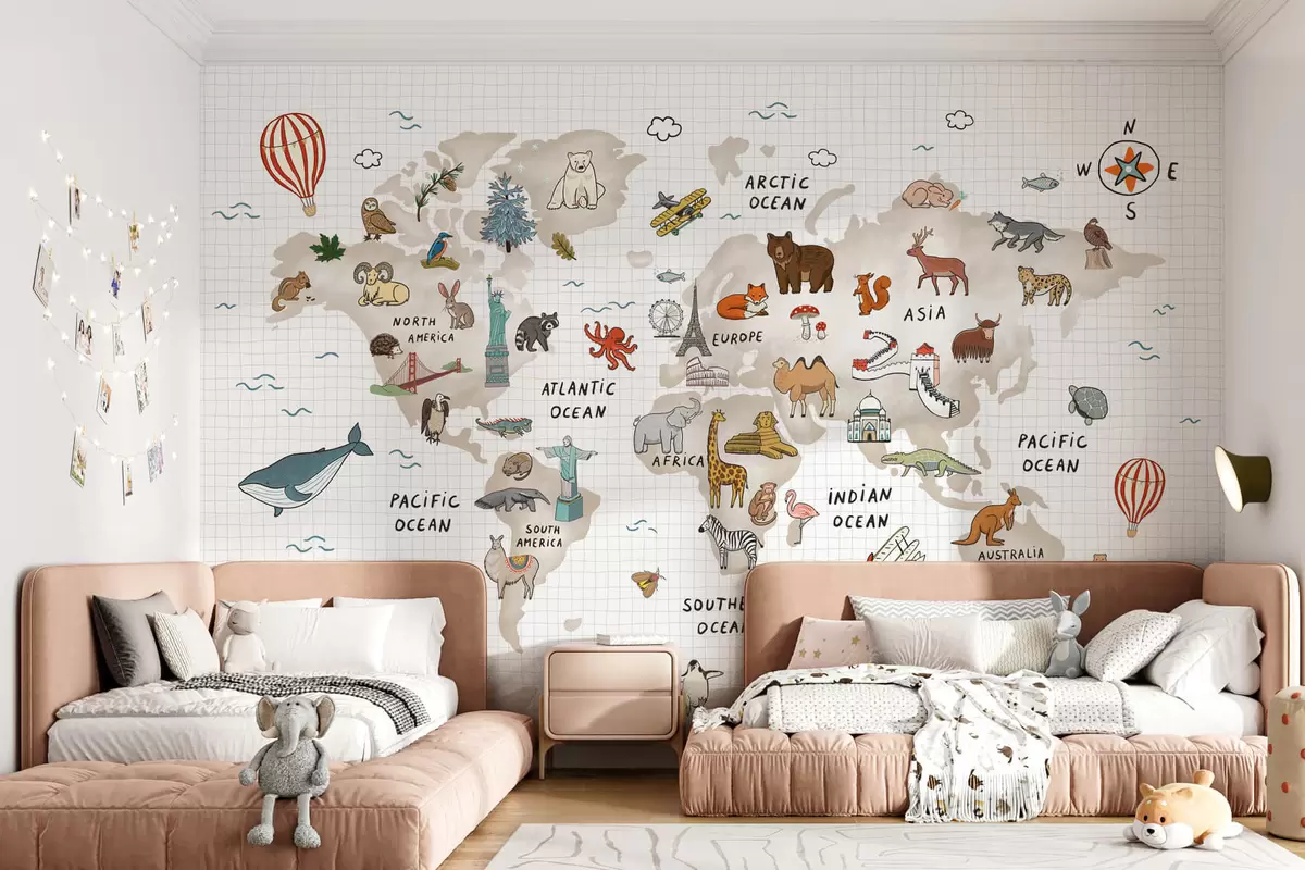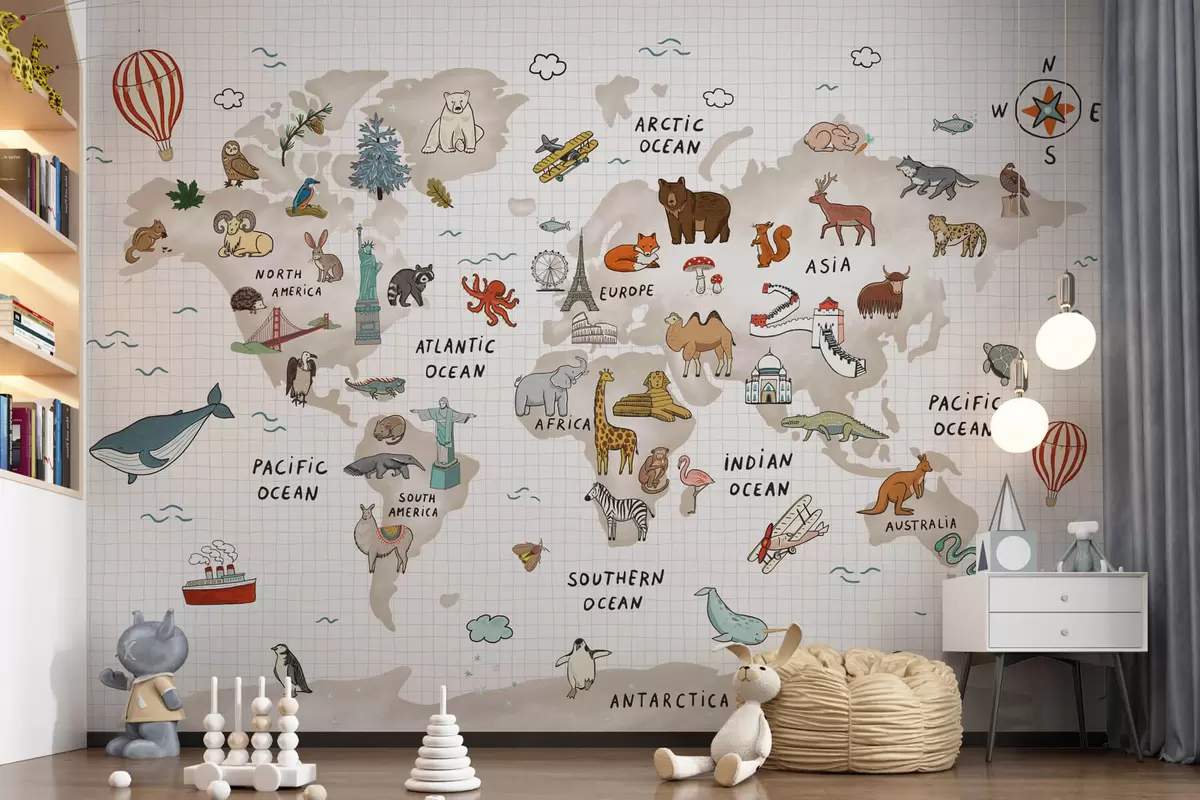 Τοιχογραφίες Παγκόσμιος χάρτης με ζώα και ορόσημα Nr. w04011