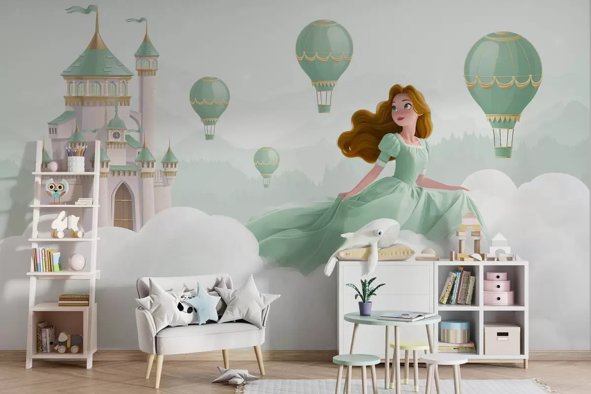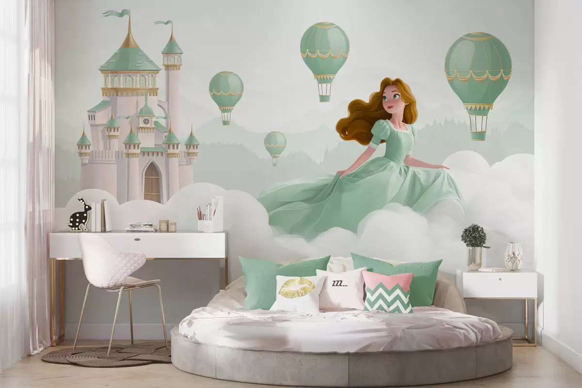 Τοιχογραφίες Πριγκίπισσα ανάμεσα στα σύννεφα στο φόντο του τοπίου με το κάστρο Nr. w04015v2