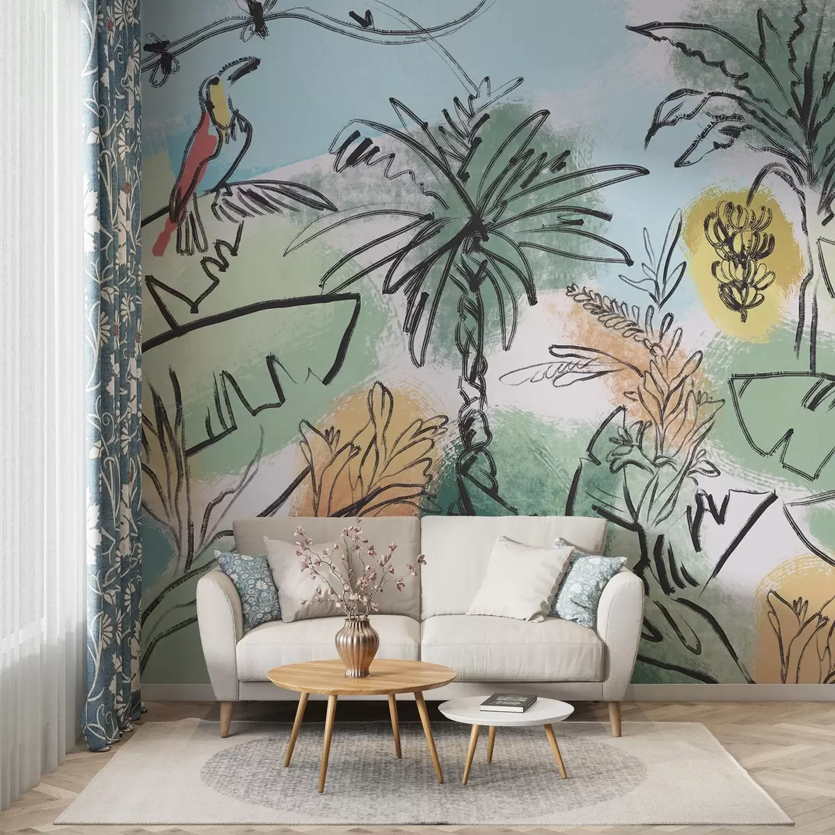 Τοιχογραφίες Τροπική εκτύπωση με παπαγάλους, πλούσια χρώματα, τροπικές περιοχές Nr. w04019