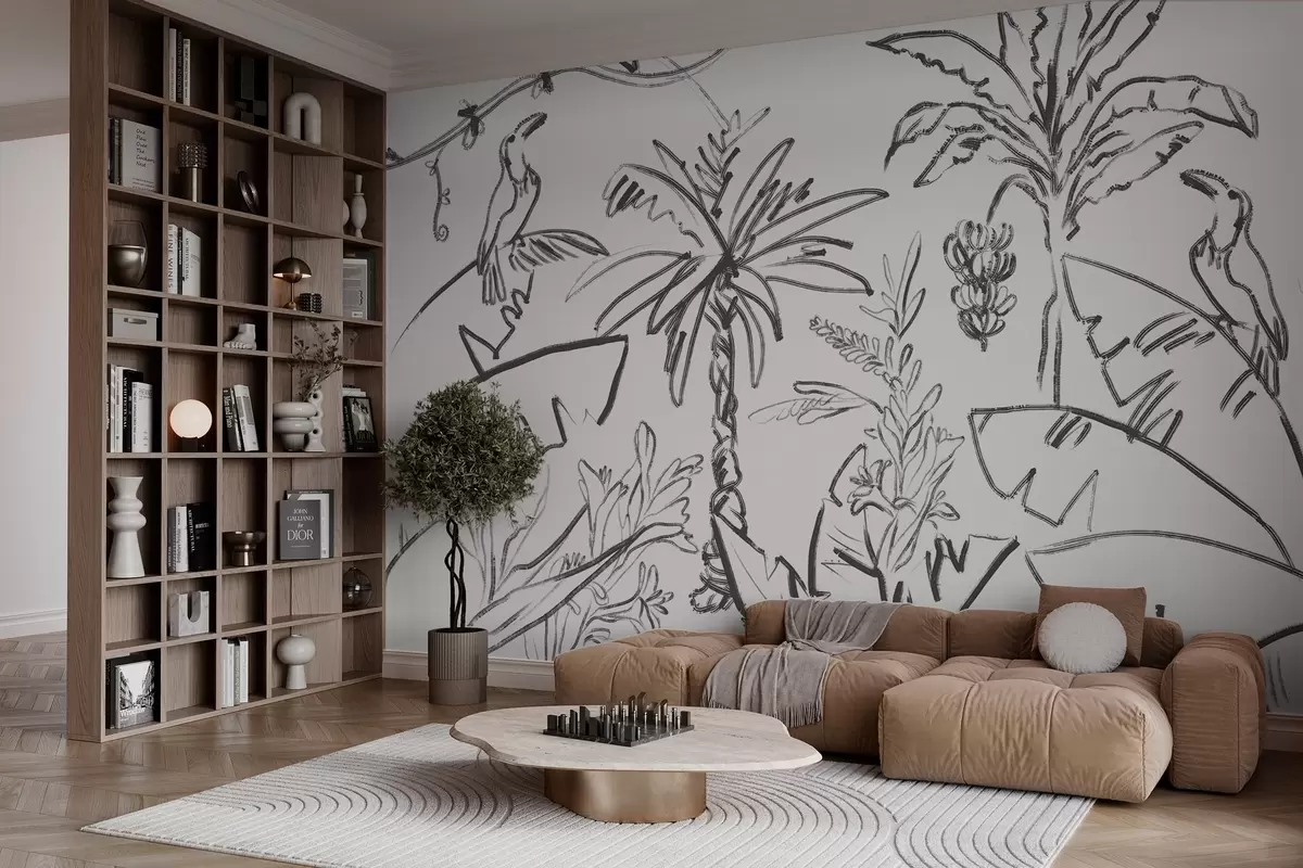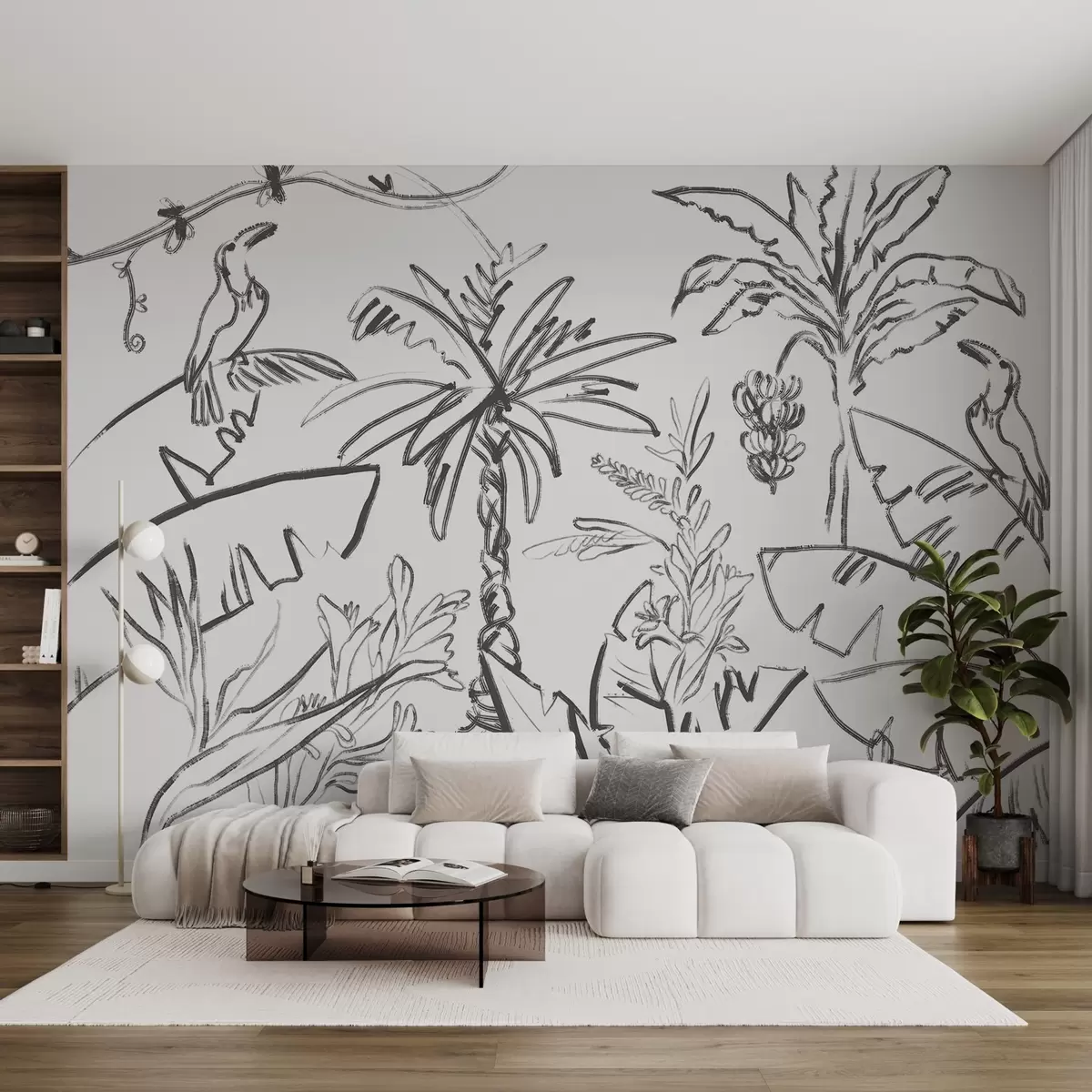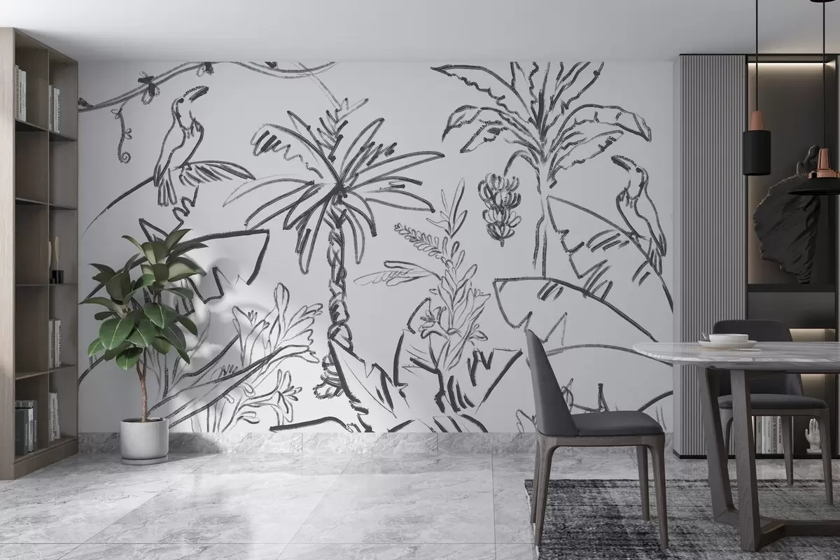 Τοιχογραφίες Τροπικό σχέδιο γραμμής, μπανάνες, φοίνικες, γραφικά περιγράμματος Nr. w04020