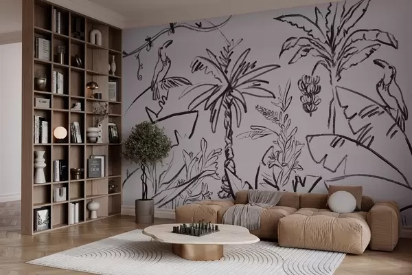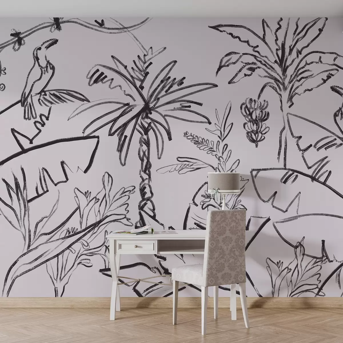 Τοιχογραφίες Τροπικό μοτίβο σε μαύρο χρώμα, φοίνικες, μπανάνες, γραφικά σε περίγραμμα Nr. w04020v7